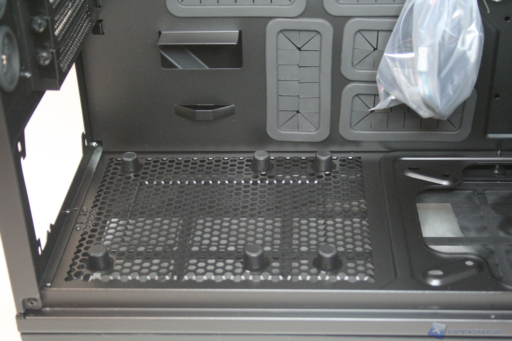 Il posizionamento dell’alimentatore è classico, quindi nella parte inferiore e posteriore dello chassis. Sono presenti sei distanziatori gommati antivibrazione e la lunghezza massima consentita è fondamentalmente irrilevante, dato che potete installare anche i modelli più lunghi in commercio, ovviamente però in assenza di un radiatore anteriore. In questo caso, qualora fosse presente un modello da 280mm, come potete osservare nelle fotografie può esserci qualche problema nel cablaggio; a tal proposito si consiglia l’utilizzo di alimentatori sullo stile dell’FSP Aurum Pro 1kW, dotati di connettori SLIM verticali, molto pratici e soprattutto compatibili con questo modello.