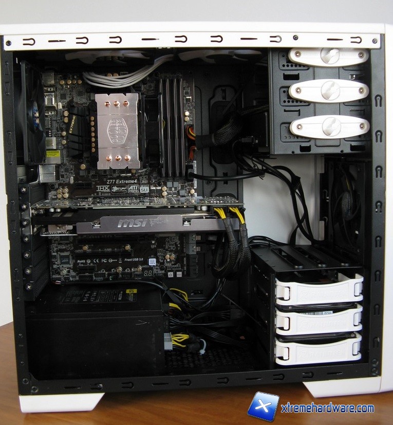 In primo luogo evidenziamo il poco spazio a disposizione delle ventole sul top, è consigliabile pertanto installarle prima di inserire la scheda madre ed il dissipatore della cpu; lo spazio è appena superiore ai 25mm dunque le ventole entrano davvero per qualche millimetro.