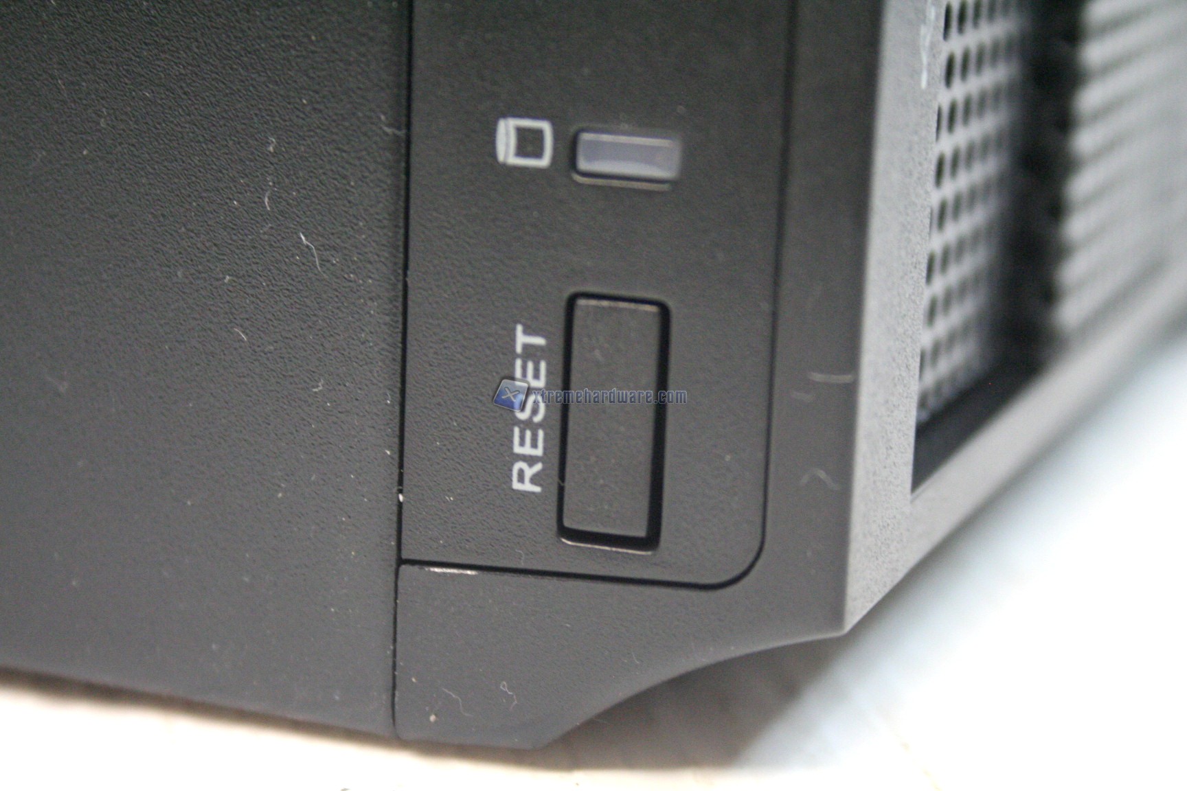 Il case frontalmente, come preventivato poc’anzi, presenta una ventilazione passiva frontale grazie alla presenza di una paratia con fori esagonali, in mesh. Escludendo la presenza dei classici tre slot da 5.25” nella parte superiore, l’unica caratteristica peculiare è la presenza di due protrusioni di plastica, che potrebbero sembrare maniglie, ma che in realtà sono solamente un motivo estetico. In altro, nella porzione superiore, troviamo il pulsante di reset e di accensione.