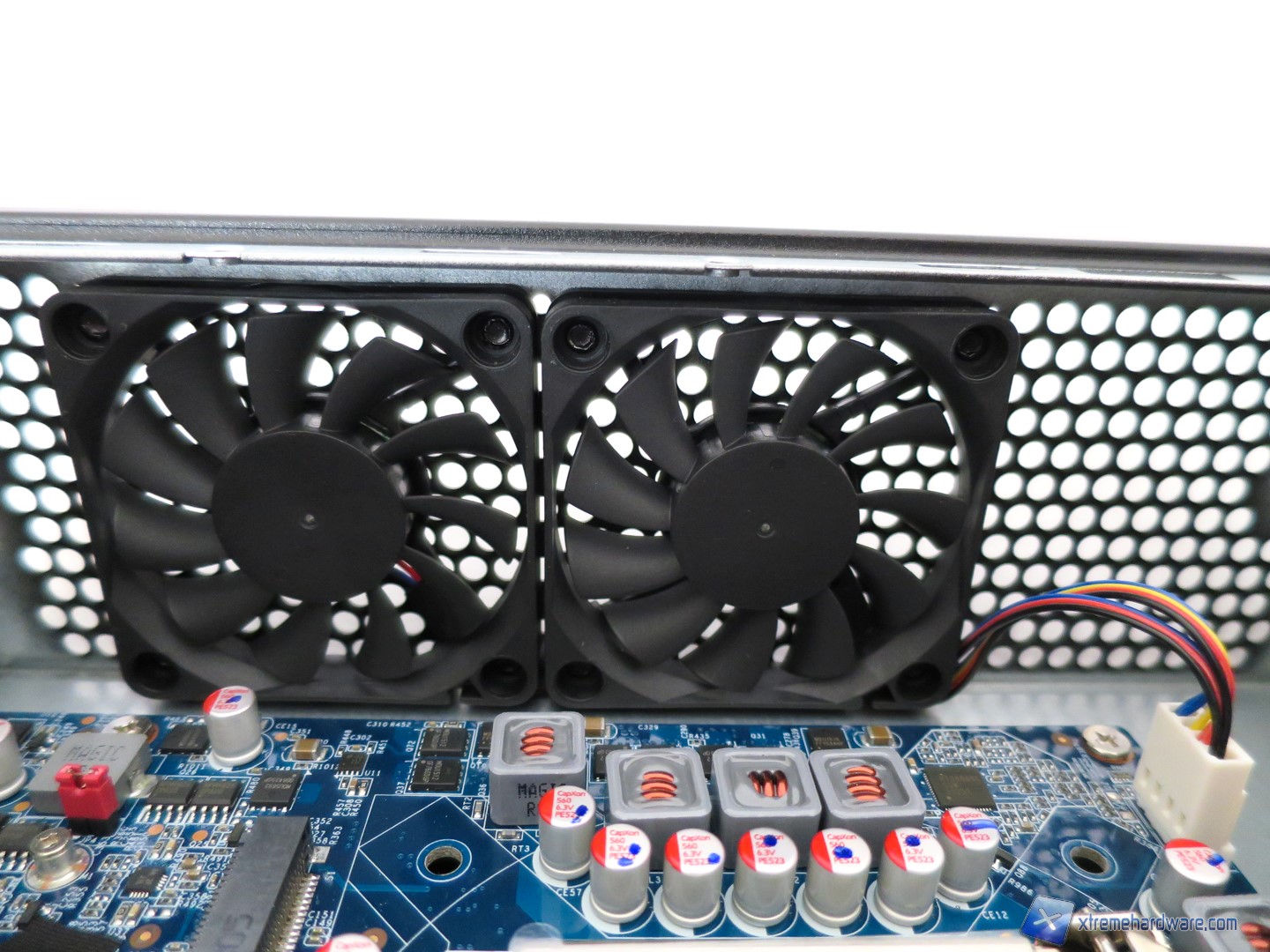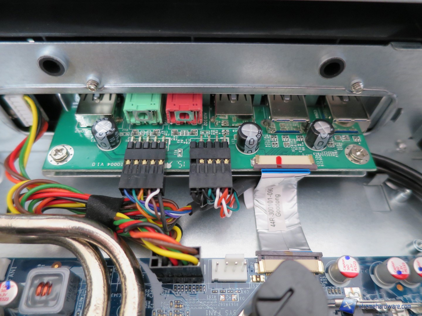 Notiamo subito come il PCB con le porte frontali dell’unità sia collegato alla scheda madre tramite un cavo flat con in più un classico set di cavi/connettore proprietario.