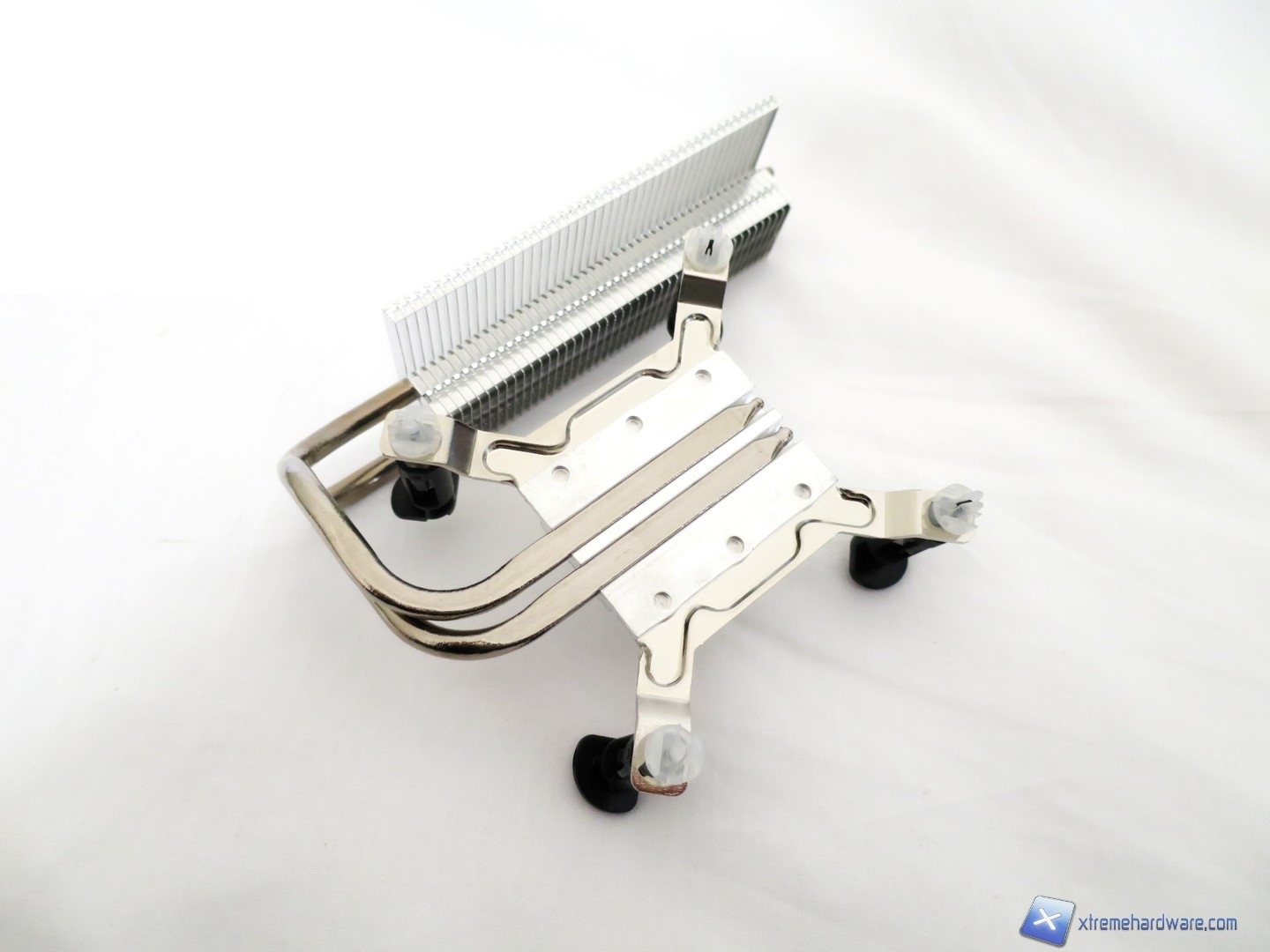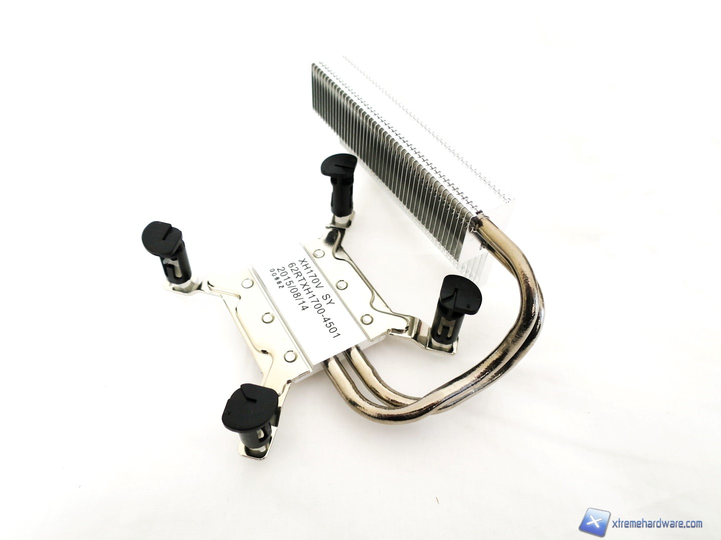 Rimuoviamo ora il dissipatore per dare uno sguardo anche a quest’ultimo. Esso prevede sistema di montaggio Push Pin tipico dei dissipatori Stock di Intel o di altri Aftermarket di medie prestazioni. E’ dotato di un corpo in alluminio nickelato e di due heat pipes HDT che escono dal lato destro per terminare in un corpo lamellare di discrete dimensioni. Qualità e cura per i materiali buona per un sistema votato più che altro alla multimedialità e all’utilizzo office.