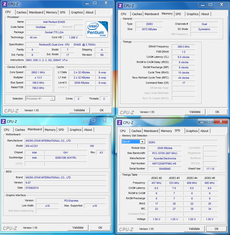 Il personal computer che ci ha fornito MSI è un esemplare di preproduzione (sample) che differisce di alcuni particolari rispetto alla versione che troveremo nel mercato retail italiano. Inoltre in alcuni paesi gli esemplari venduti potranno avere alcune differenze. Il microprocessore montato sul pc che ci è giunto in redazione è un Intel® Pentium Dual Core E5400 che adotta una tecnologia produttiva a 45nm e funzionamento da 2.7 GHz, mentre per quanto riguarda la DRAM presente nel nostro pc abbiamo una quantità di 3 GB suddivisa in due moduli di 1GB e 2GB ciascuno. Sono memorie di tipo Sodimm, DDR3 PC-3 10600 prodotti da Hynix (Hyundai Elettronics). Cpu-z riporta erroneamente come PC3-10700. Il SouthBridge è un Intel G41 mentre il NorthBridge è un Intel ICH7.