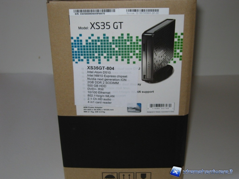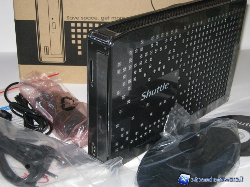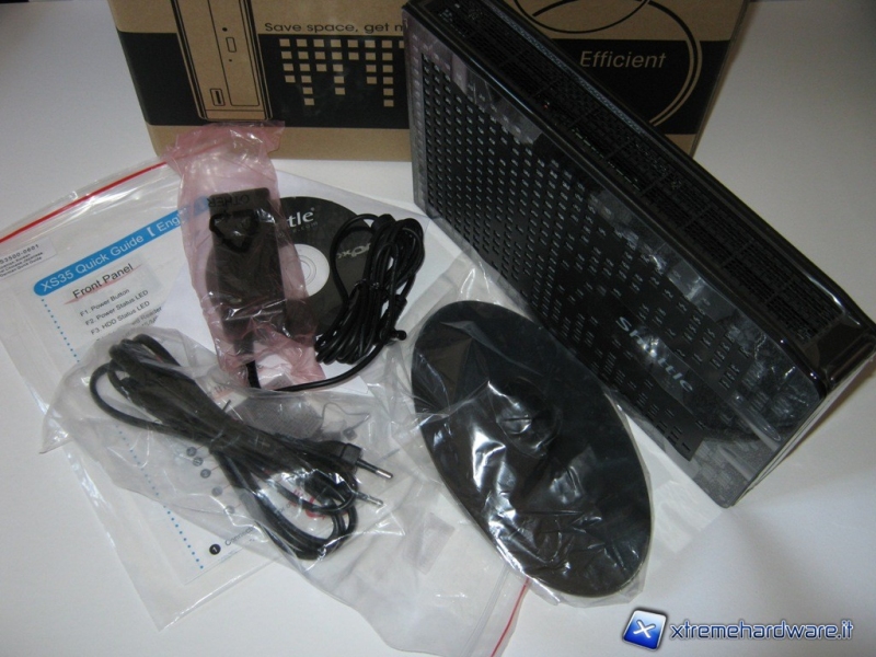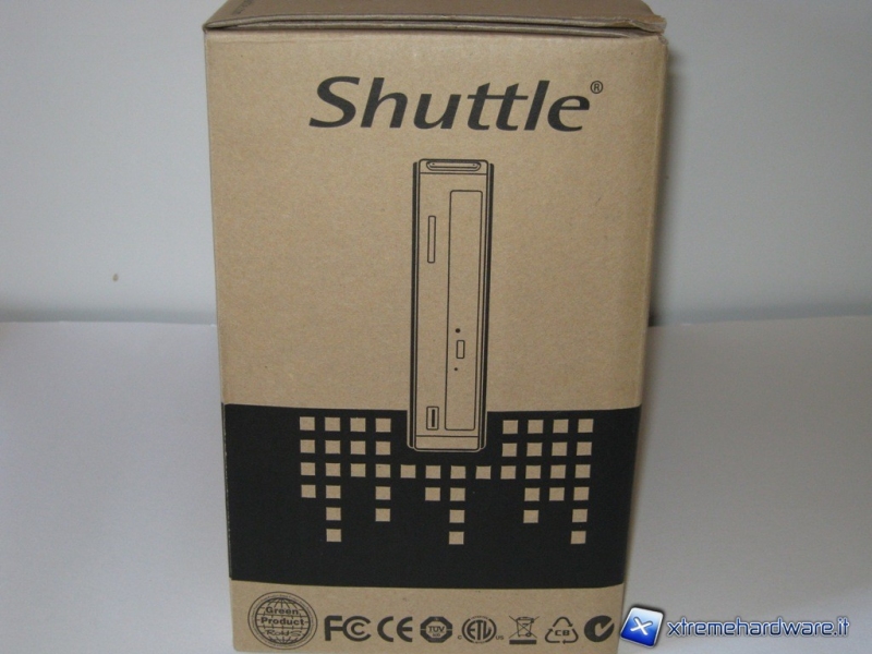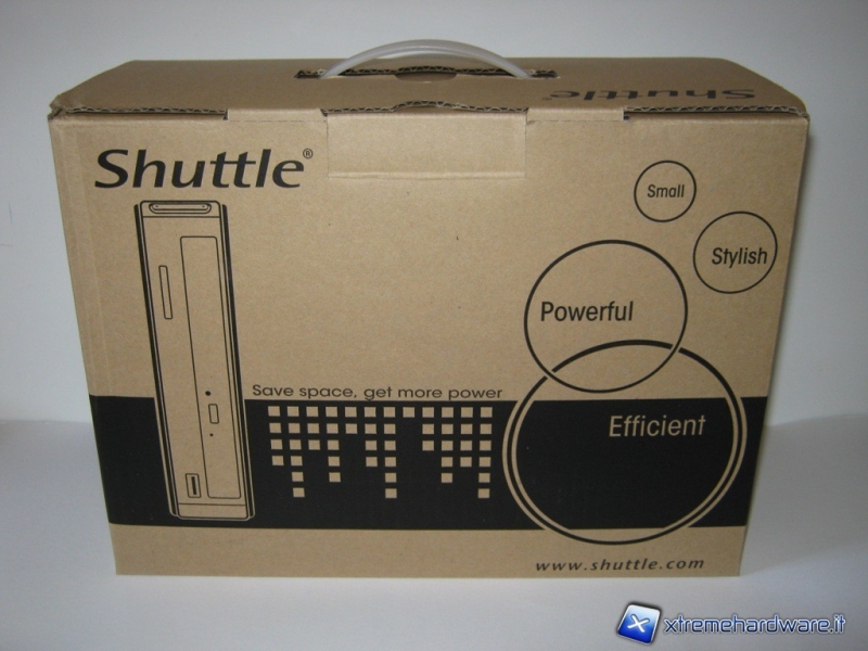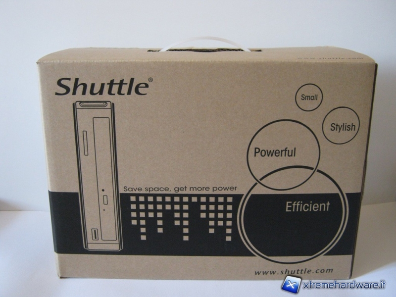 Il nuovo mini-pc XS35GT-804 della Shuttle, giunto in redazione, mostra una semplice confezione cartonata con il disegno del prodotto, il logo e quattro parole racchiusi in dei cerchi “Small, Styllish, Powerfull, Efficent” (Piccolo, Elegante, Potente, Efficiente) che ci fanno capire fin da subito con che tipo di prodotto avremmo a che fare.