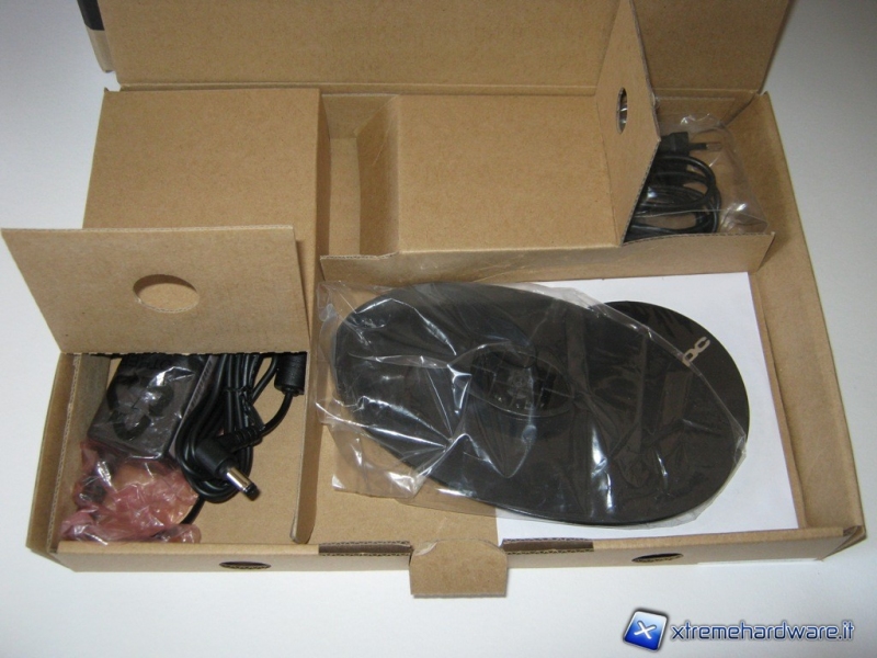 All’interno di questa confezione troveremo una base ovale di metallo pesante che dovrà essere installata, tramite una vite, sul fondo del mini-pc permettendo un posizionamento stabile in verticale, il cd con i vari driver e l’alimentatore con il rispettivo cavo.