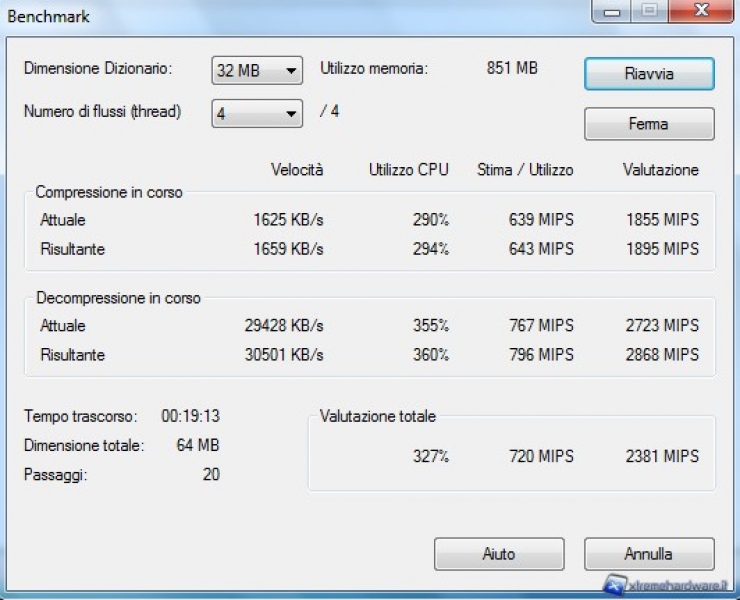7-Zip integra un benchmark interno con il quale è possibile selezionare il numero di threads da eseguire in parallelo a seconda della tipologia di processore utilizzato. Riporta i risultati in MIPS dei test di compressione e decompressione.
