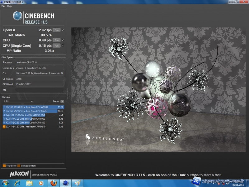 Cinebench 11.5 permette di valutare le capacità di rendering di un processore, utilizza lo stesso engine del programma Cinema 4D. Il benchmark misura le prestazioni del processore sia in modalità single threaded, sia sfruttando tutti i core a disposizione del sistema.