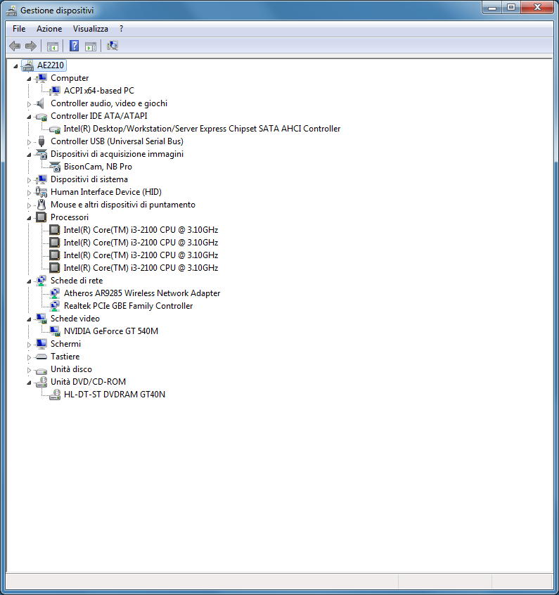 L'hard disk in dotazione è prodotto dal famoso marchio Western Digital; il modello è un WD10EARS-22Y5B1 ovvero un Western Digital Caviar Green da 1TB contraddistinto da un basso consumo ed una bassa rumorosità a scapito di prestazioni leggermente inferiori. Nel nostro caso l'hard disk è partizionato: 650 GB circa sono dedicati al salvataggio dei dati, mentre 350 GB circa sono dedicati al sistema. È importante far notare che sul sito ufficiale la dotazione prevede l'utilizzo di un hard disk da 640 GB e non da 1TB. Probabilmente, il sample da noi ricevuto, non è dedicato al nostro mercato nonostante la lingua del sistema operativo sia proprio in italiano. L'unità ottica, HL-DT-ST GT40N, è invece prodotta da LG. A seguire troviamo la scheda di rete Ethernet prodotta da Realtek, mentre quella wireless è prodotta da Atheros. Possiamo osservare una schermata di HW info che riassume la dotazione: