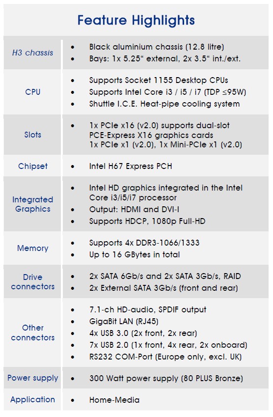 Nonostante le dimensioni estremamente compatte, il modello SH67H3 offre molto spazio al suo interno, è possibile ad esempio alloggiare un'ulteriore scheda grafica PCI-Express di tipo discreto; la scheda madre è dotata di ben quattro slot di memoria di tipo DDR3, uscite video HDMI / DVI-I, interfaccia di connessione unità di archiviazione SATA 6Gb/s, porte USB 3.0, Gigabit LAN, audio a ben 8 canali surround con uscita S / PDIF e External Serial-ATA. Nell'SH67H3 è inoltre possibile inserire un'unità esterna da 5.25" ed altre due unità esterne/interne da 3.5".
