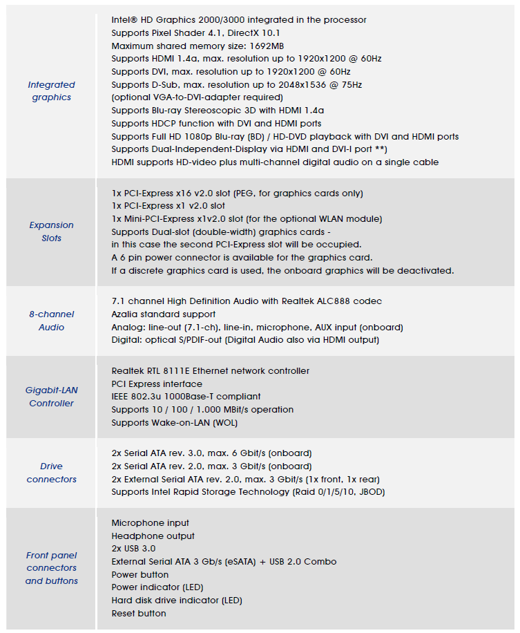 Le cpu supportate da questo sistema sono di tipo Socket LGA 1155 Intel Core di seconda generazione i3 / i5 / i7 con un TDP massimo di 95W. Il controller di memoria integrato nella cpu supporta moduli fino a 4 x 240 pin DDR3-1066/1333 SDRAM (PC3-8500/10600) in Dual Channel. E' possibile installare moduli da 4 GB per DIMM, per una quantità totale pari a 16 GB.