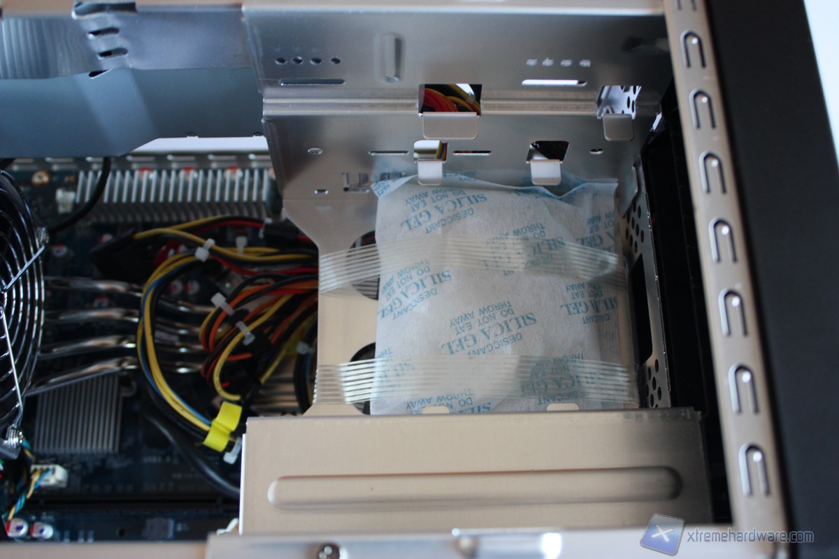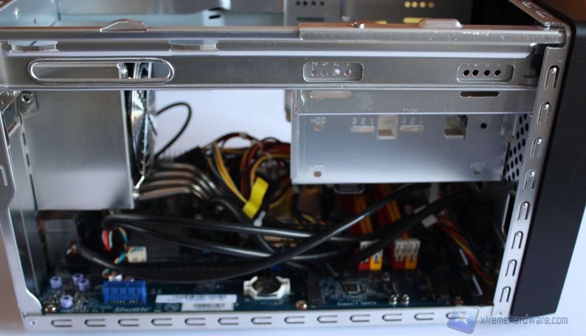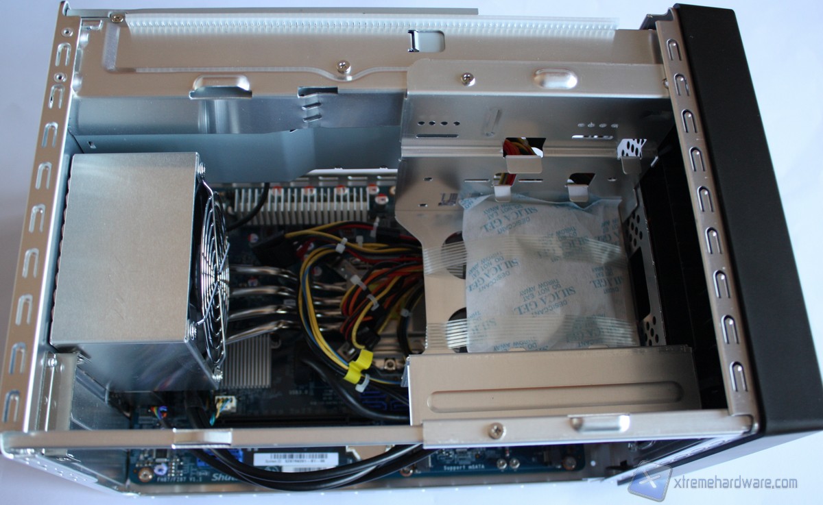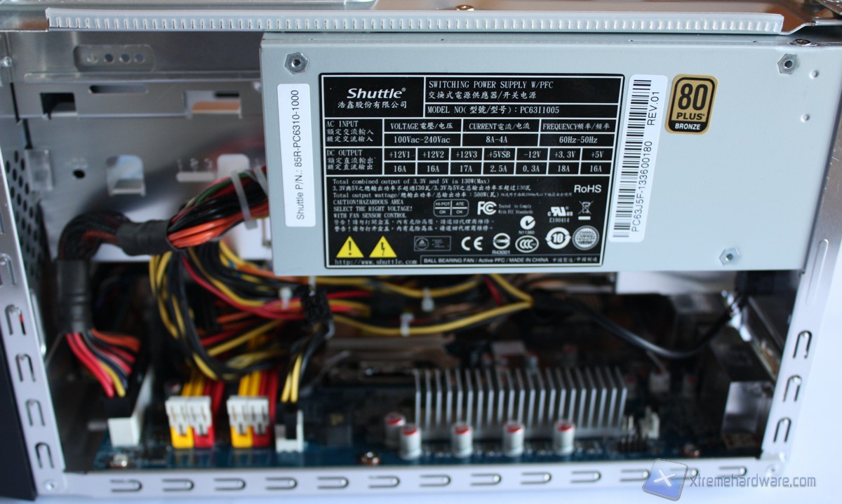 Come possiamo notare l’ordine e la cura sono di casa per Shuttle ed infatti possiamo notare sulla sinistra l’imponente dissipatore I.C.E. 2 con relative heat-pipes e la grande ventola da 92mm, adibita allo smaltimento del calore generato dalla CPU. Sulla destra troviamo il cestello per l’Hard Disk o SSD (di cui non sono presenti adattatori per l’installazione) ed un’unità da 5,25 pollici. Al di sotto troviamo invece la scheda madre di fabbricazione Shuttle modello FH87/FZ87 V1.1 dotata di quattro slot DDR3, uno slot PCI-Express 3.0 x16 ed uno slot PCI-Express 2.0 x4. La scheda madre posta all’interno di questo Barebone ha un Form Factor proprietario quindi non potrà essere sostituita con altre mainboard se non identiche a quella pre-installata. Un modello retail in formato mini-ITX potrebbe entrare nel cabinet ma potrebbe richiedere dei lavori di modding. Svitando le due viti poste all’estremità superiore del cestello, avremo accesso alla parte inferiore della scheda madre dove troviamo gli Slot per la memoria RAM in formato DDR. Nella parte sinistra al dissipatore I.C.E. 2 di Shuttle troviamo l’alimentatore da 500 Watt certificato 80 Plus Bronze che garantirà stabilità ed efficienza al nostro sistema.
