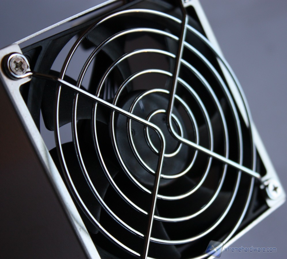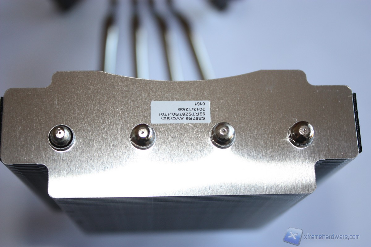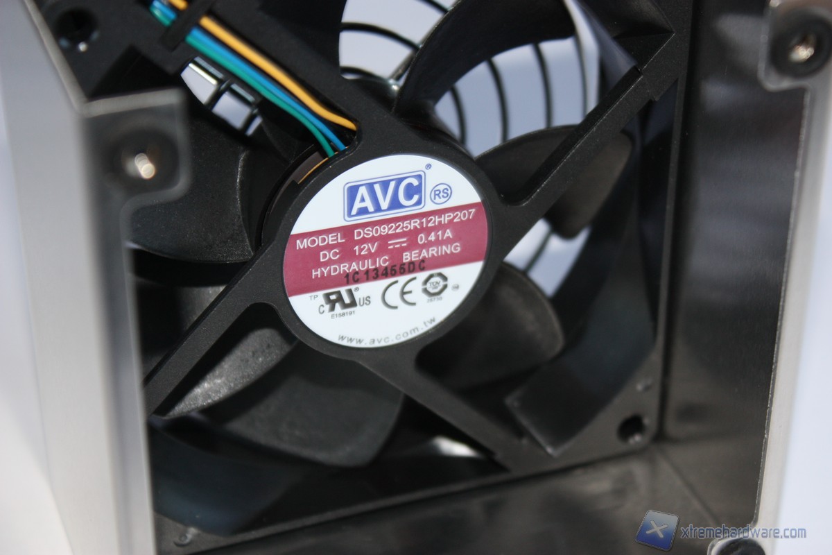 Analizzando il dissipatore, esso è dotato di una ventola della AVC modello DS09225R12HP207 con un diametro di 92 millimetri e connettore PWM a quattro pin in grado di regolare in modo adeguato la velocità di rotazione in base al carico della CPU. Il sistema di dissipazione è realizzato in un unico corpo di alluminio alettato con quattro Heat-pipes, ricordiamo che il fratello SH87R6 ne aveva solo tre, che lo percorrono fino alla base di contatto con la CPU, interamente in rame. La base di contatto non è realizzata a specchio, ma ad un primo sguardo questa risulta perfettamente planare, priva di sbavature o di difetti. Ai lati del corpo lamellare troviamo due strisce in feltro che assorbono le vibrazioni generate dal corpo metallico presente intorno a questo. Il “cestello” al suo interno ospita la ventola da 92mm, è ben rifinito e presenta il logo XPC inciso nella parte esterna del corpo.