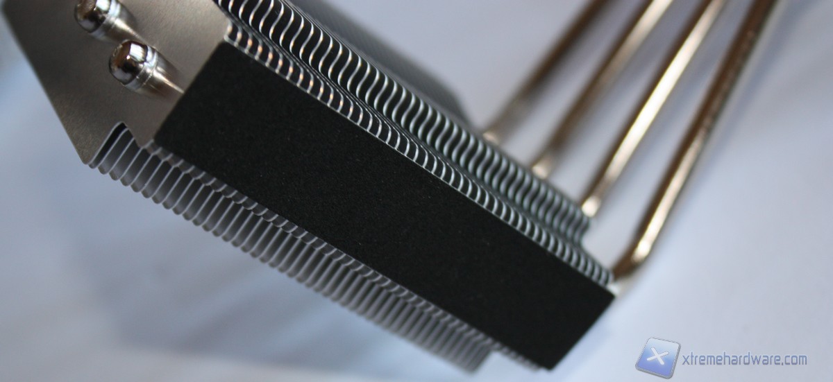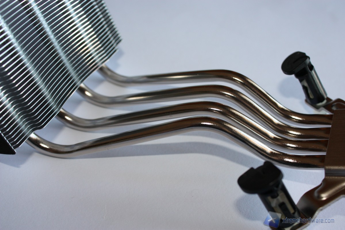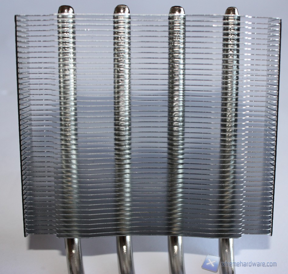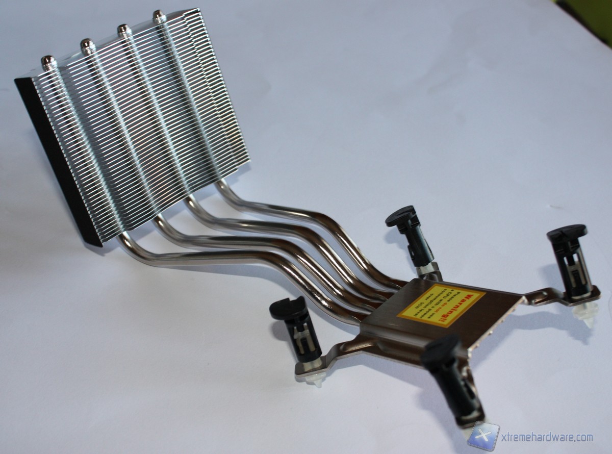 Analizzando il dissipatore, esso è dotato di una ventola della AVC modello DS09225R12HP207 con un diametro di 92 millimetri e connettore PWM a quattro pin in grado di regolare in modo adeguato la velocità di rotazione in base al carico della CPU. Il sistema di dissipazione è realizzato in un unico corpo di alluminio alettato con quattro Heat-pipes, ricordiamo che il fratello SH87R6 ne aveva solo tre, che lo percorrono fino alla base di contatto con la CPU, interamente in rame. La base di contatto non è realizzata a specchio, ma ad un primo sguardo questa risulta perfettamente planare, priva di sbavature o di difetti. Ai lati del corpo lamellare troviamo due strisce in feltro che assorbono le vibrazioni generate dal corpo metallico presente intorno a questo. Il “cestello” al suo interno ospita la ventola da 92mm, è ben rifinito e presenta il logo XPC inciso nella parte esterna del corpo.