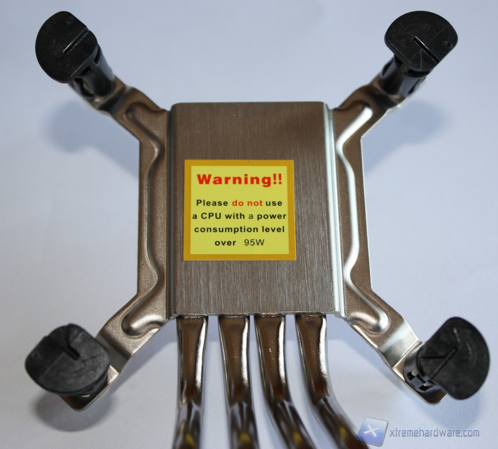Tornando sull’imponente dissipatore, una volta smontato svitando quattro viti nel retro del case e i quatto ganci classici dei dissipatori stock Intel, troviamo sotto di esso la zona CPU con il relativo Socket protetto da una pellicola plastica adesiva che preserva il prodotto nuovo sino a che l’utente non monterà la CPU.