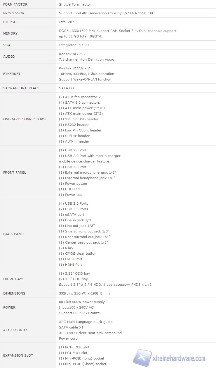 Riportiamo le specifiche tecniche dello Shuttle XPC Barebone SZ87R6.