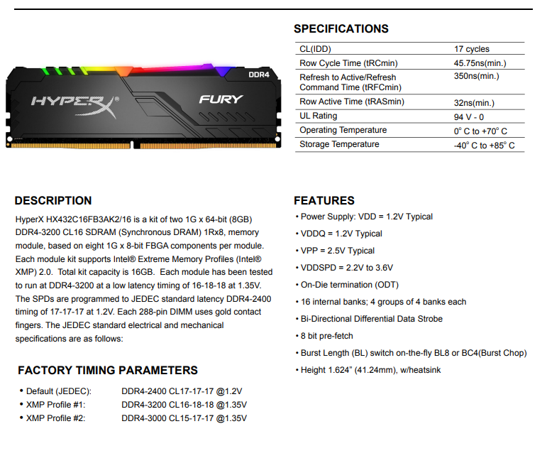 L'azienda ci ha inviato gentilmente un kit di HyperX Fury RGB DDR4 da 16GB composto da 2 banchi da 8GB operanti alla frequenza di 3200MHz, frequenza supportata dalle nuove CPU Ryzen 3xxx presentate sul mercato prprio quest'anno; modello HX432C16FB3AK2/16 aventi CAS Latenci pari a 16.