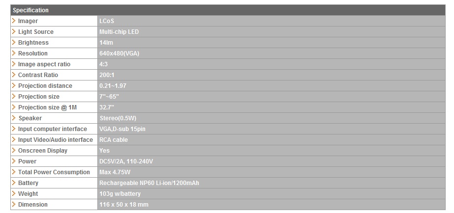 Le sue ridotte dimensioni lo rendono un oggetto molto pratico da portare in giro, leggero e compatto, dotato di 5 pratici pulsanti sul fronte che permettono di navigare all’interno del menù. Sempre nella parte alta del proiettore è presente una ghiera per la messa a fuoco manuale dell’immagine.