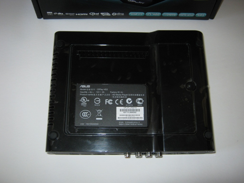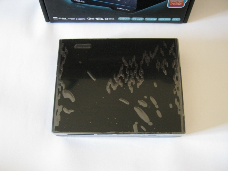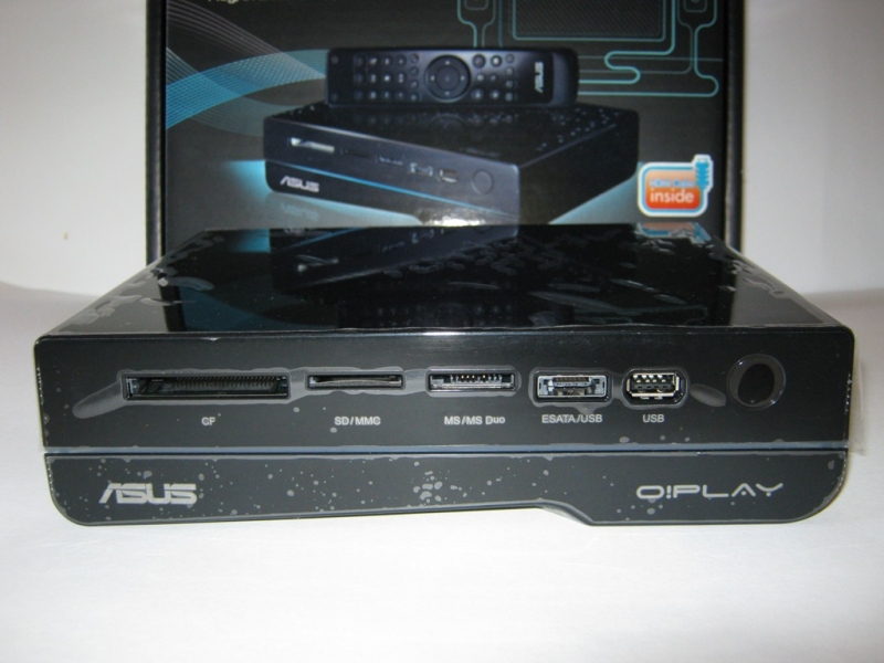 Nella parte frontale, oltre al marchio ASUS e O!PLAY in bella vista, troviamo da sinistra a destra gli slot per varie schede di memorie: CF fino a 64GB CF v4.1, SD/MMC fino a 32GB SDHCv2.0 e 2GB MMC v4.2 e MS/MS Duo fino a 28MB MS v1.43 e 32GB MS Pro v1.03. Di seguito una porta combo eSATA/USB2.0 e una porta USB2.0 e infine il ricevitore IR (a Infrarossi) che permette l’uso del telecomando IR con il lettore multimediale.