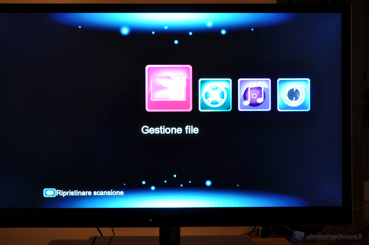 Attraverso il menù gestione file possiamo accedere ai vari dispositivi connessi al media player, ovvero l’hard disk interno, le periferiche USB e le cartelle di rete, che analizzeremo più in dettaglio nelle prossime pagine.