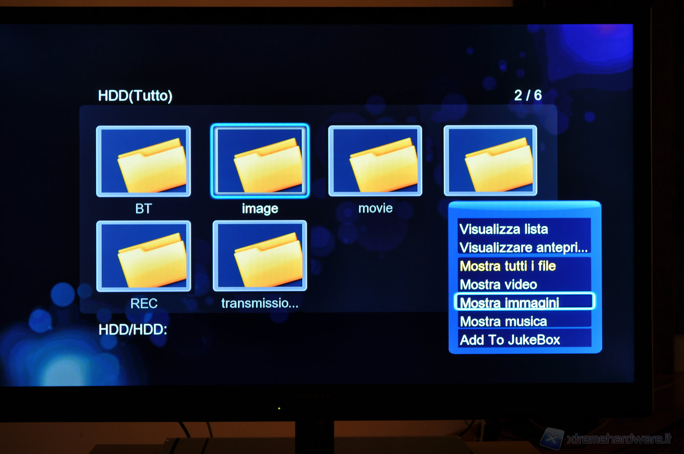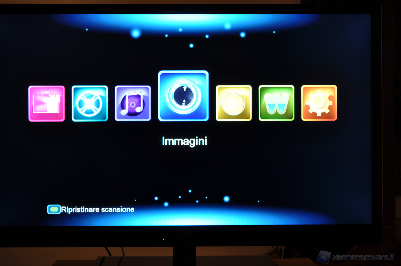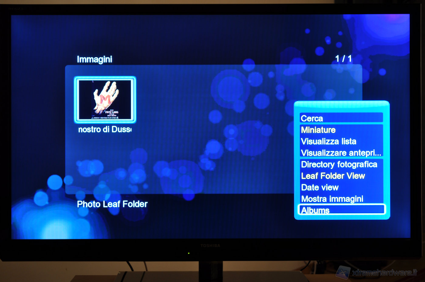 Navigando tra le varie cartelle, il software ci propone già un’anteprima del contenuto con un’ottima velocità di caricamento delle stesse. Selezionando una cartella di immagini possiamo impostare la modalità di riproduzione (tempo dell’intervallo, formato, transizioni). Queste impostazioni sono di solito disponibili selezionando il tasto menù nel telecomando. Dipendentemente dal tipo di applicazione o formato che stiamo eseguendo esso ci consentirà di variare una grande quantità di impostazioni.