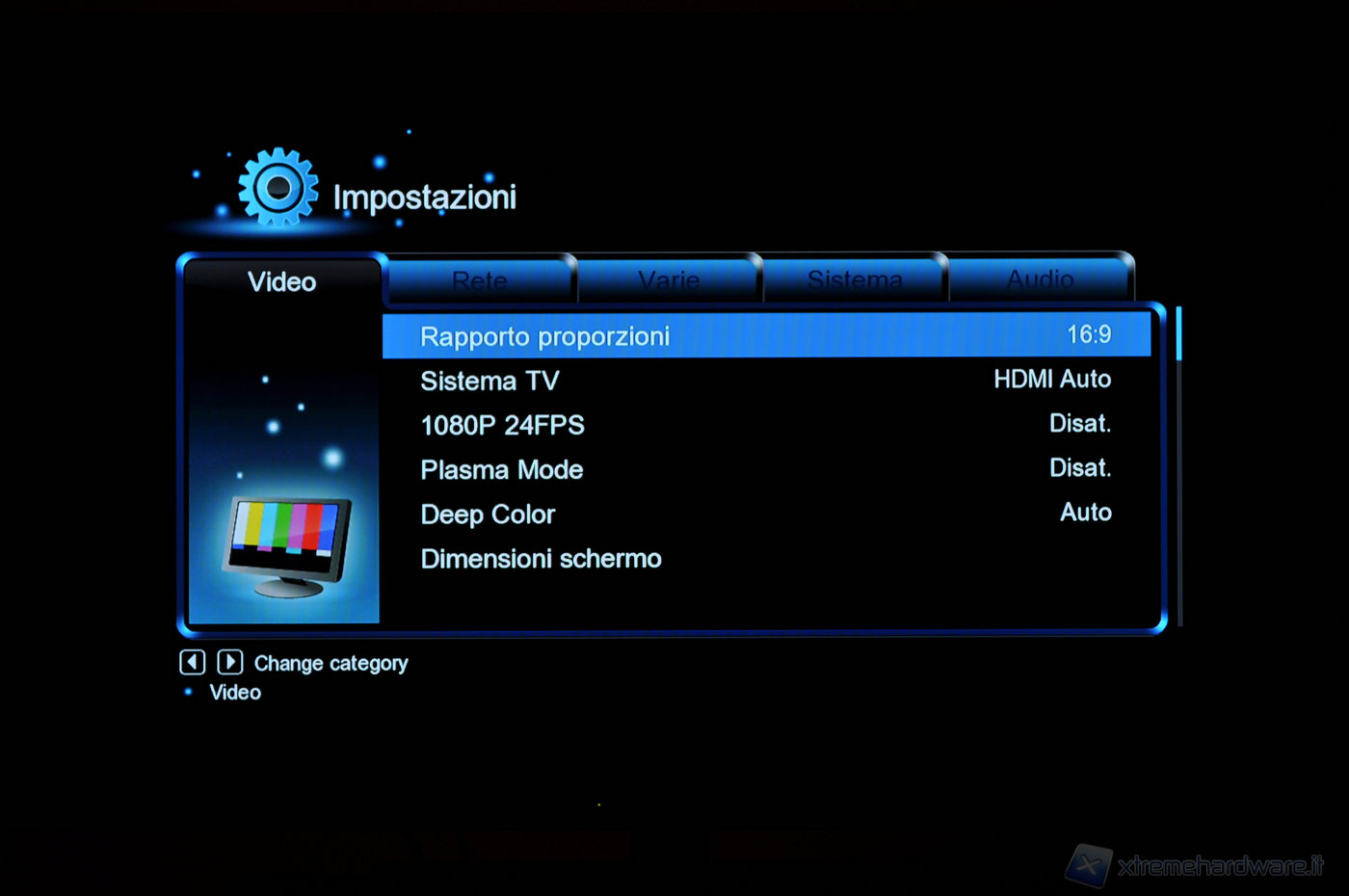 Diamo uno sguardo anche alle impostazioni, molto utili per calibrare correttamente l’output sulla nostra TV. Vi è persino una funzione per calibrare il quadro dell’immagine, in modo da adattarla alla perfezione al nostro schermo.