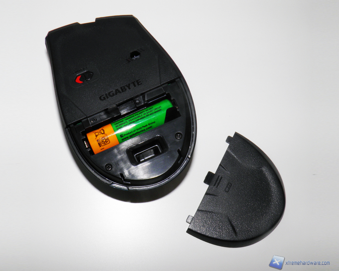 Il vano batteria è nella parte inferiore del mouse, una linguetta permette la facile estrazione della batteria una volta inserita, inoltre, è possibile riporre il ricevitore wireless all'interno del mouse.