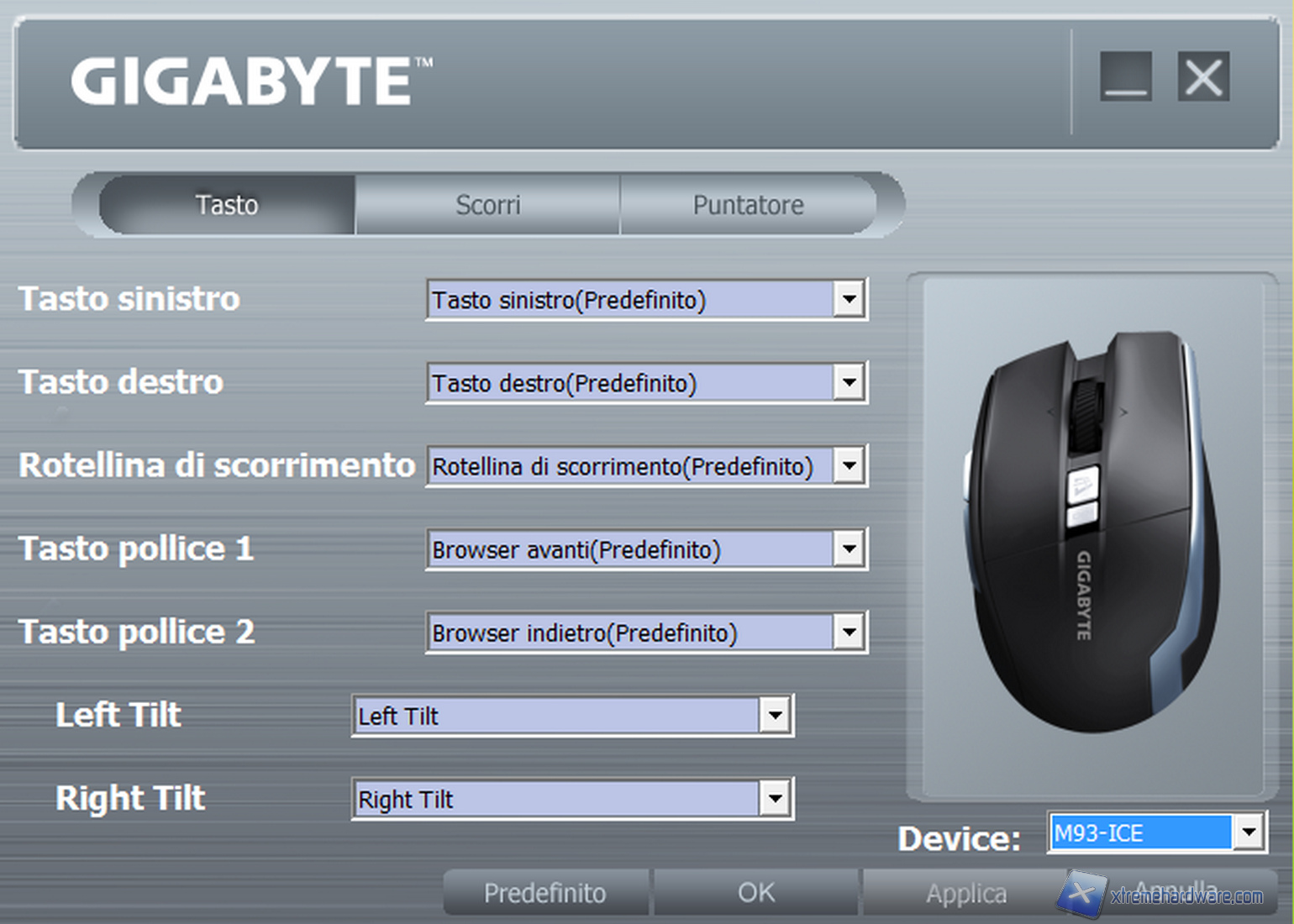 I driver del Gigabyte AIRE M93 ICE ci permettono di mappare i tasti scegliendo una tra le tante funzioni disponibili nei driver, da quelle basiche fino a funzioni più complesse come la riduzione ad icona o l'apertura di una applicazione. È presente anche la possibilità di replicare un tasto della tastiera.