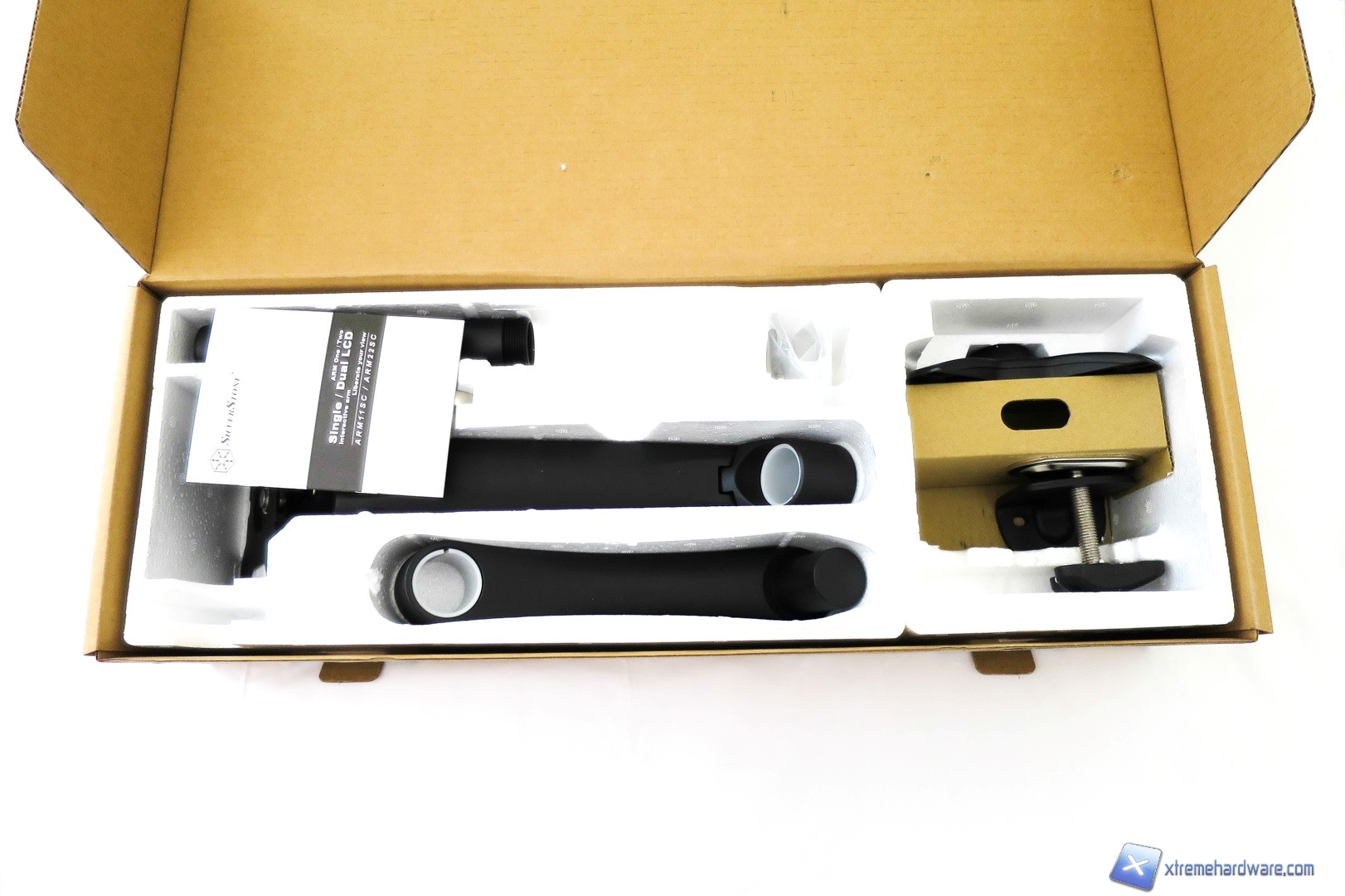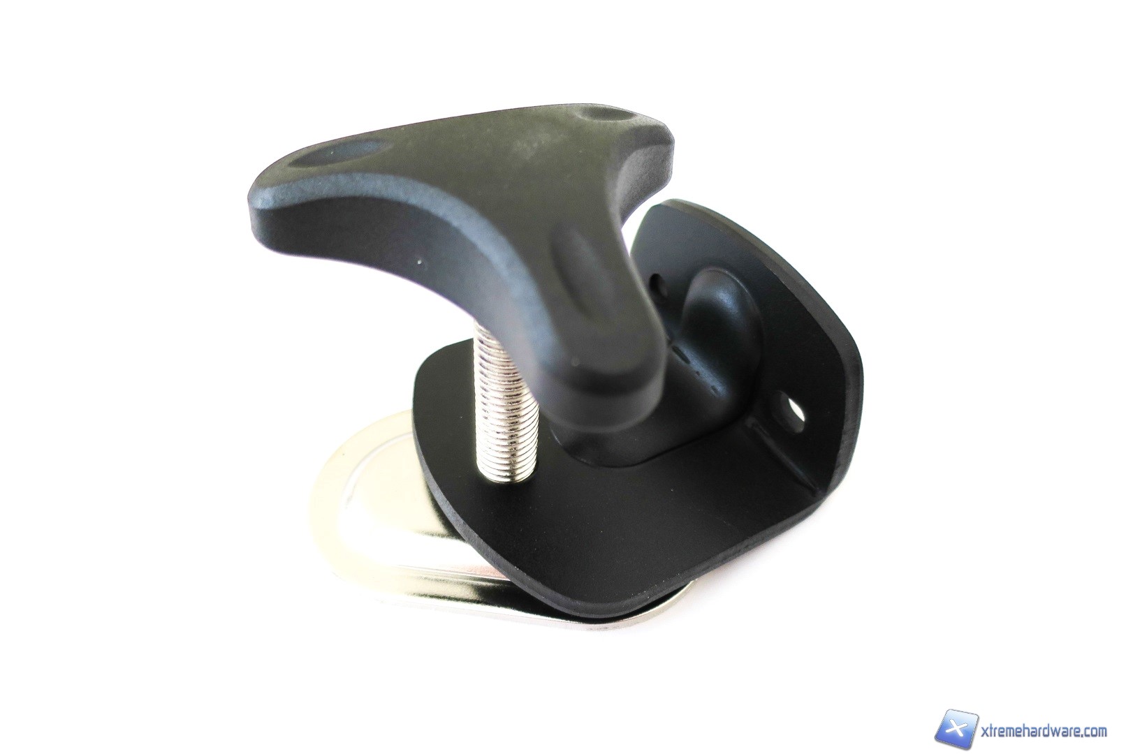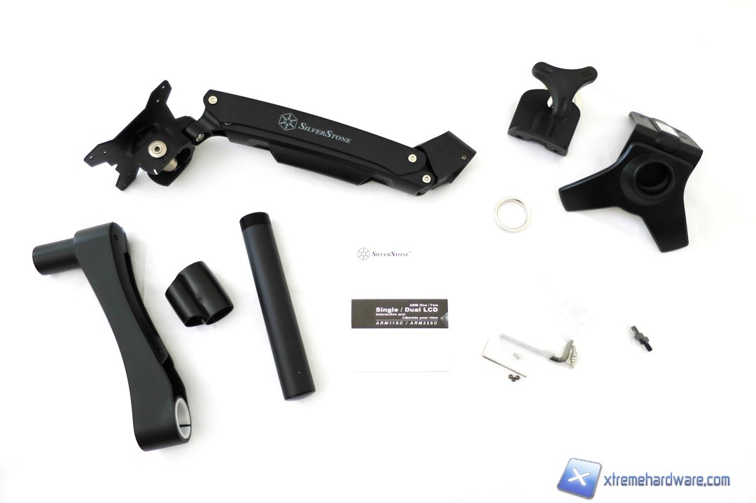 Se non siete pratici o non avete mai assemblato uno stand per monitor vi consigliamo di consultare il piccolo manuale in dotazione con il bundle. Pur essendo l’assemblaggio abbastanza intuitivo, procediamo con una piccola descrizione dei componenti e con il relativo ”montaggio guidato”. Come prima cosa, estratti i componenti, troviamo una colorazione nera opaca per ogni singolo pezzo dalla base sino ai bracci. La qualità dei componenti è assicurata da una realizzazione in metallo e finemente curata come SilverStone fa anche con i propri case ed alimentatori. Partiamo ora dalla base che è dotata di due “artigli” ed ha una forma quasi triangolare con al centro nella parte superiore il foro filettato per avvitare successivamente il primo supporto. Nella parte inferiore la base presenta una superficie in gomma/tessuto in modo tale da evitare di graffiare o danneggiare il piano dove andrà successivamente fissata. Con la base viene fornita anche la staffa con perno in metallo e basetta che dovrà essere innanzitutto avvitata al supporto della base se successivamente avvitata al piano dove dovremo collegarla, ruotando la maniglia con rivestimento in plastica.
