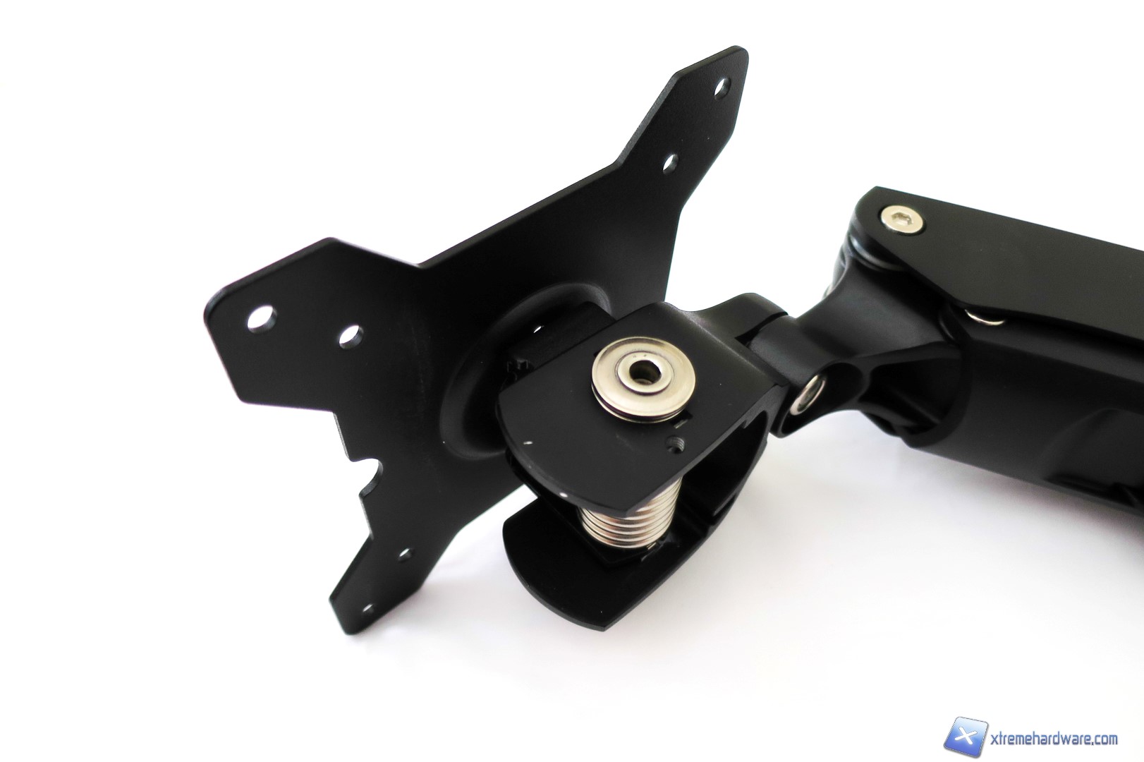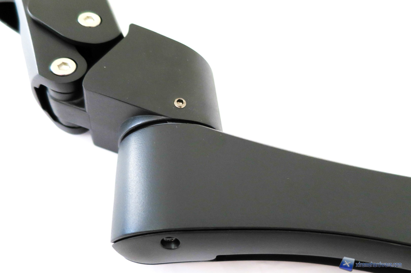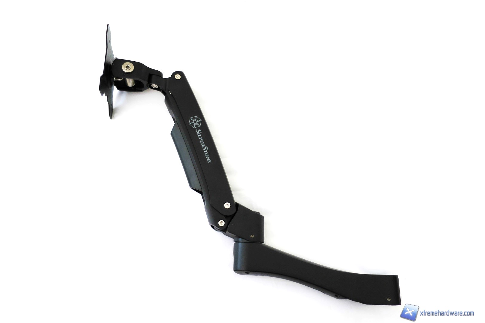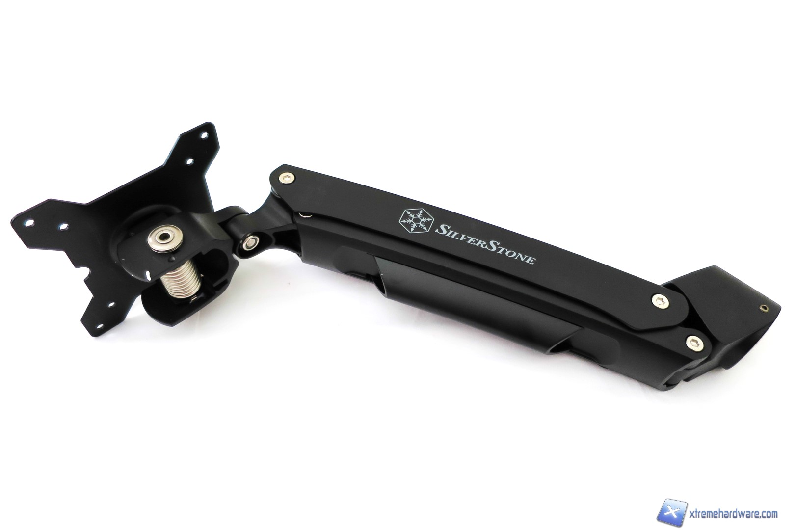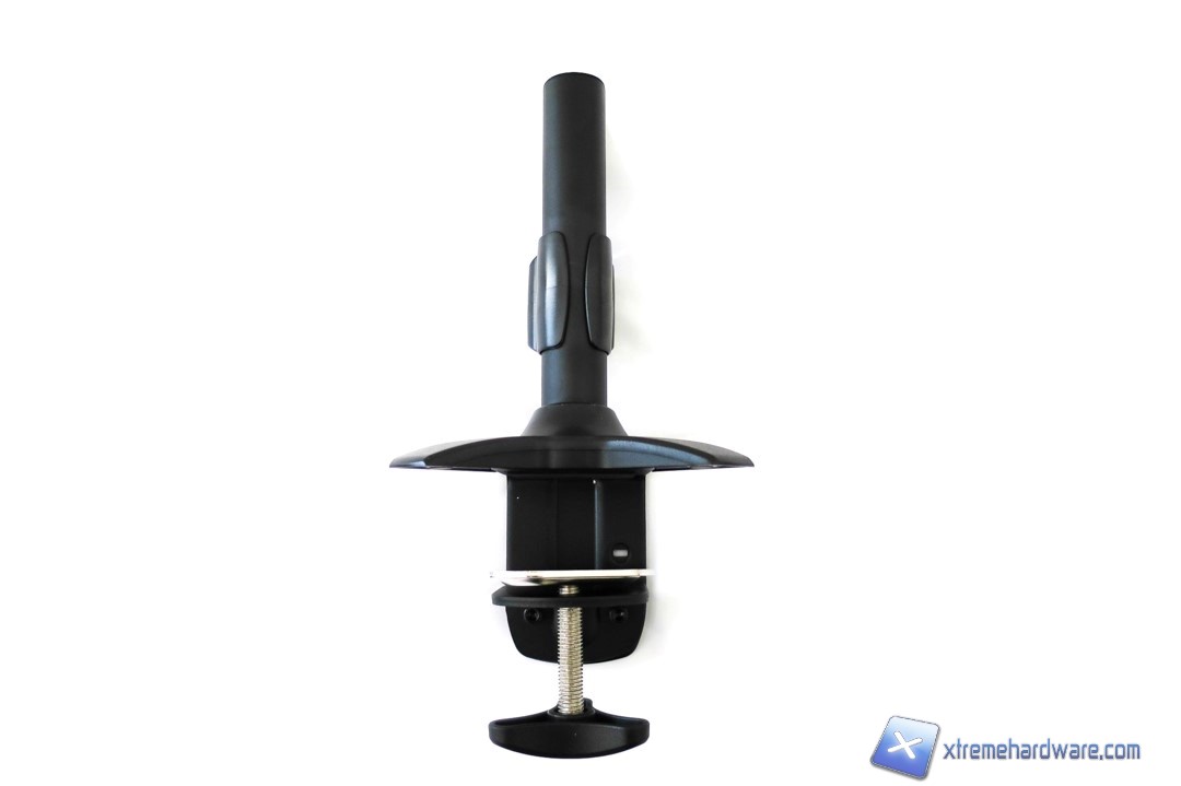 Passiamo ora al braccio principale del SilverStone ARM11BC. Tale braccio, non solo è più grande ma è anche più pesante in quanto al suo interno è presente una molla che servirà come estensore in lunghezza e come fermo una volta trovata l’angolazione. Non manca inoltre il supporto VESA in metallo presente all’estremità destra del braccio. Come abbiamo detto, questo è il braccio principale e potrà essere montato direttamente sul supporto della base. Nel caso in cui volessimo ampliare la lunghezza massima dello stand dovremo utilizzare entrambi i bracci che potranno essere regolati come abbiamo visto dalle immagini nel capitolo Specifiche Tecniche. Il braccio integra inoltre un supporto in plastica lungo il suo corpo per effettuare un cablaggio utile a risparmiare spazio ed evitare l’aggrovigliamento di cavi. L’intero sistema di montaggio e tenuta dello stand di SilverStone è attuabile tramite semplici dadi e viti di dimensioni compatte che potranno tenere facilmente un monitor con supporto VESA 75/100 e peso complessivo di 10Kg. Non sarà dunque un problema montare un monitor anche da 27 o più pollici, a patto che sia compatibile con lo standard VESA.