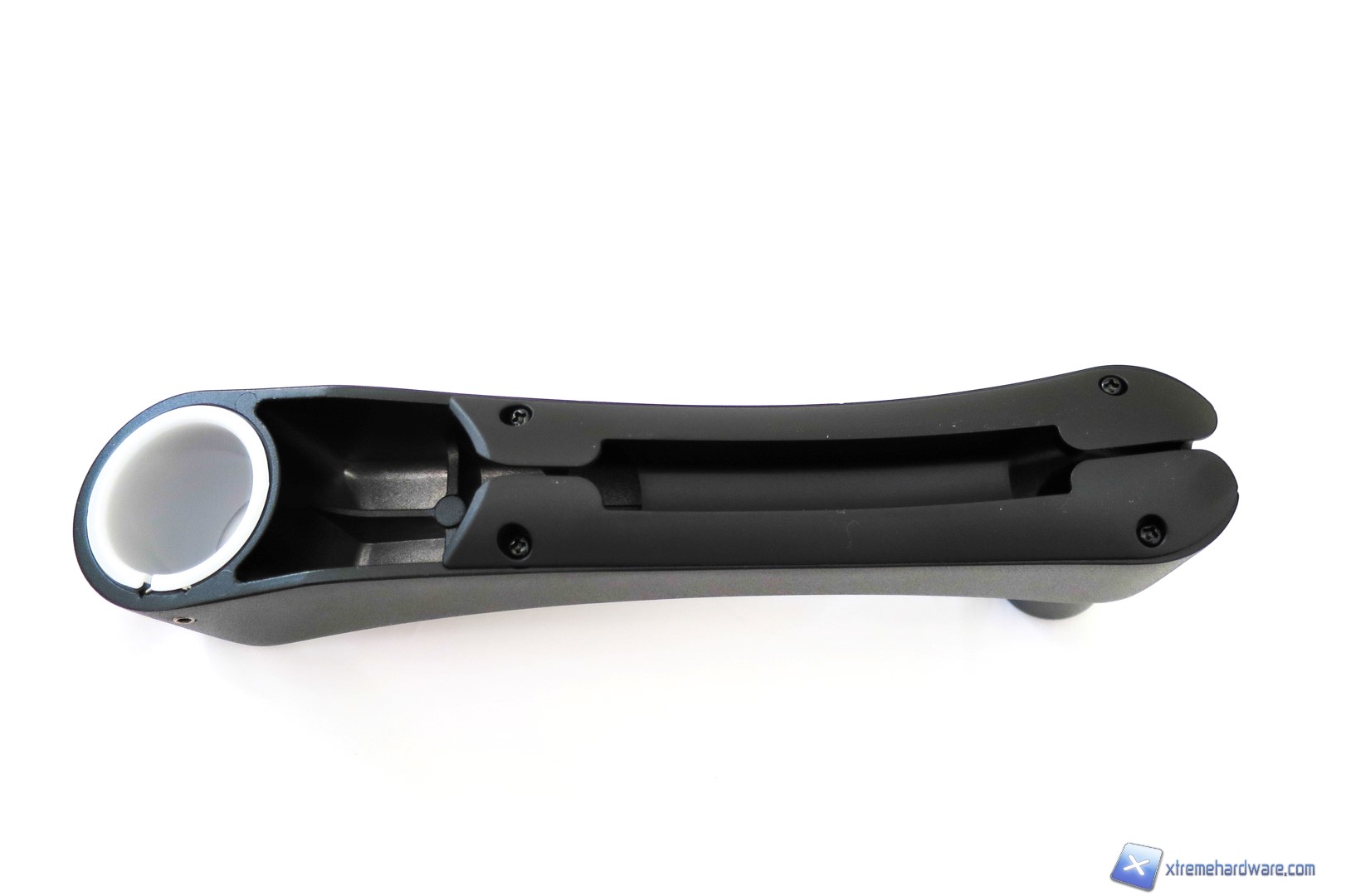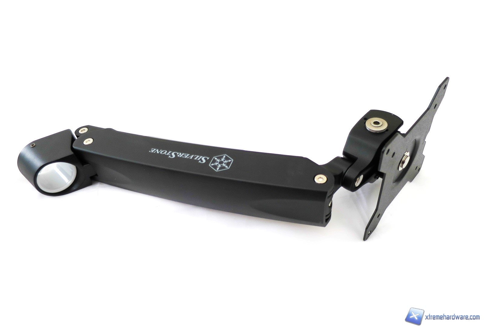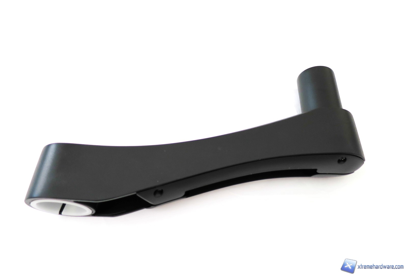 Passiamo ora a dare uno sguardo ai due bracci in metallo. Prima di fare ciò, ricordiamo che a seconda della collocazione e di un eventuale raggio dello stand potremo scegliere se ampliarlo con entrambi i bracci o utilizzare solo quello principale con la scritta SilverStone ed il passacavi. Detto ciò, prendiamo il primo dei due bracci, che nel dettaglio ha una forma che tende ovviamente verso l’alto. Anche questo braccio ha un passacavi ma è offerto dalla struttura stessa del braccio. Se da un lato troviamo il perno in metallo che ci servirà per aggiungere il secondo braccio, dall’altro abbiamo il foro con un una guarnizione in plastica che verrà bloccata da un dado posto a lato del braccio.