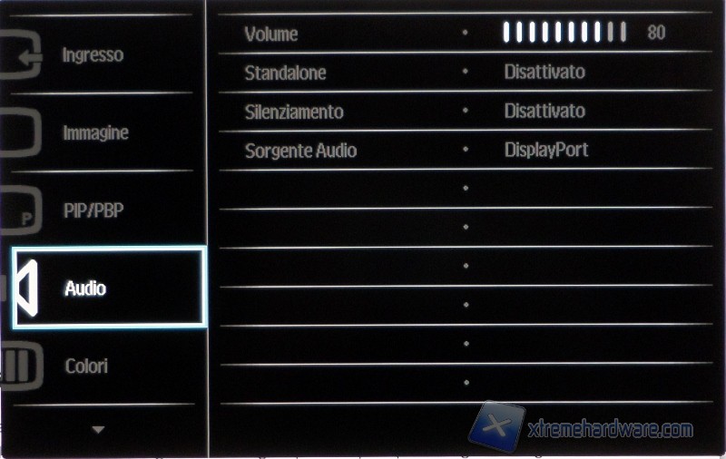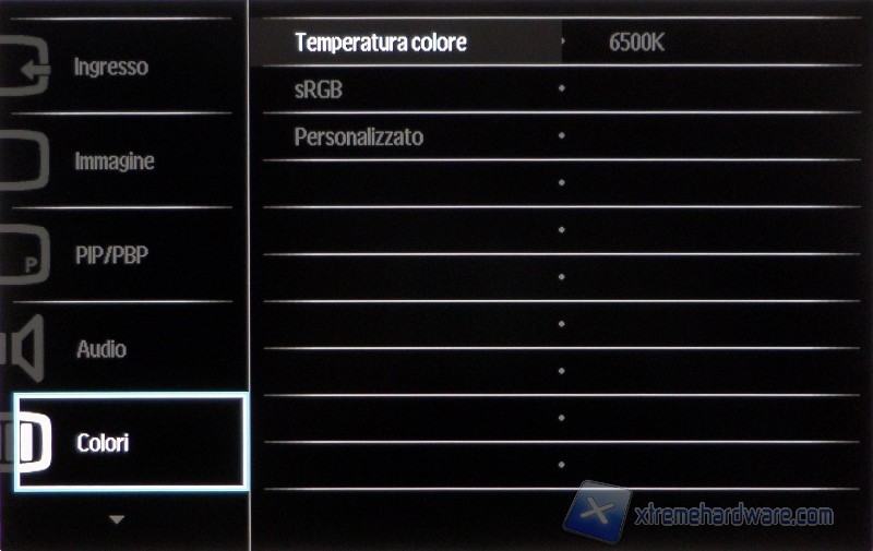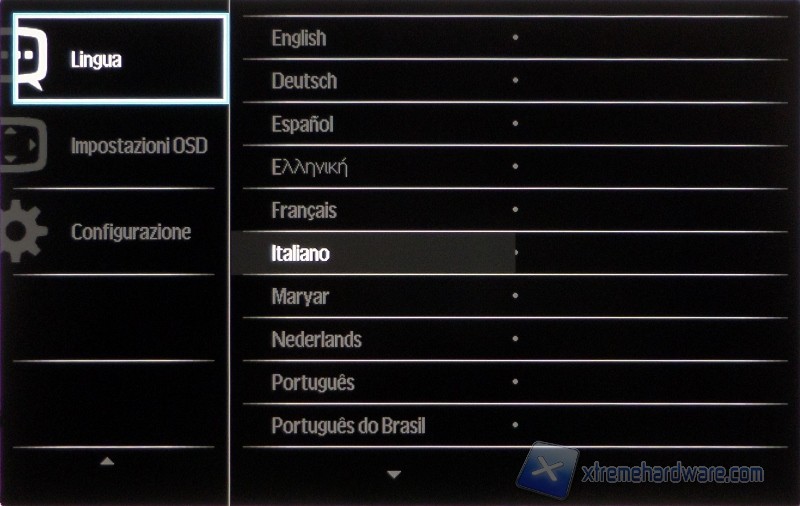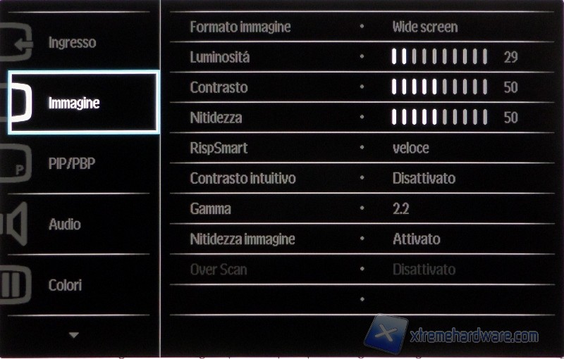 Tramite il primo pulsante si accede alle funzionalità SmartImage, tramite la quale si potrà scegliere una modalità di visione tra: Ufficio, Foto, Film, Gioco, Risparmio energetico, SmartUniformity e Disattivato (valore di default). Il manuale riporta che la modalità gioco “attiva il circuito overdrive per ottenere tempi migliori di risposta, riduce i lati deformati degli oggetti in rapido movimento sullo schermo”, ma oltre a lavorare un po’ sulla nitidezza (come del resto fa anche la modalità ufficio in maniera un poco maggiore) e alzare la luminosità, non cambia nulla. La modalità SmartUniformity dovrebbe aumentare appunto l’uniformità della luminosità in diversi punti dello schermo. Dovrebbe? Eh sì, dovrebbe, perché in realtà vedremo che i risultati non sembrano evidenziare questa miglioria.