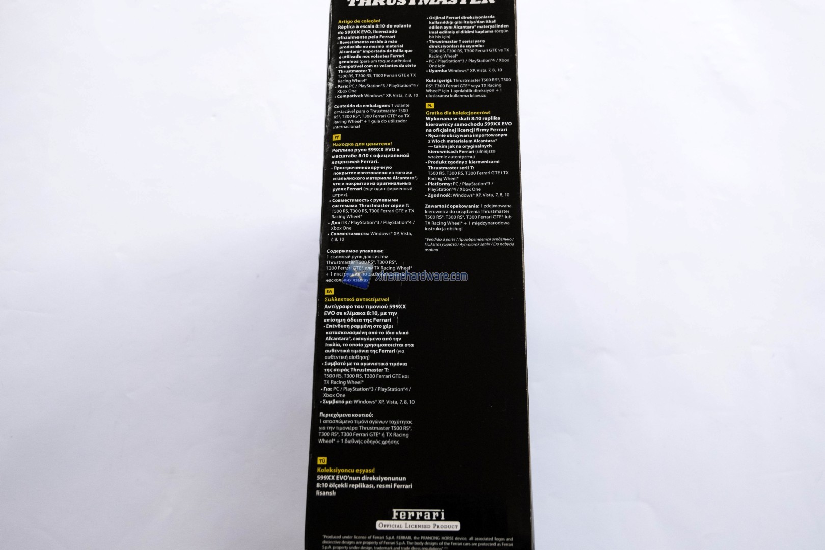In questa pagina analizzeremo la confezione e il bundle della corona 599XX EVO 30. La scatola del 599XX EVO 30 è di forma quadrata e si presenta con uno sfondo completamente nero, sul quale troviamo una grande immagine del prodotto stesso, accompagnata da diverse didascalie che ci spiegano le funzioni e le caratteristiche del prodotto. Nella parte alta troviamo il logo della Ferrari accompagnato dall’immagine di una vettura del cavallino rampante, mentre più in basso troviamo specificata la compatibilità con PC, PS3, PS4 e Xbox One e il bollino di licenza ufficiale Ferrari.