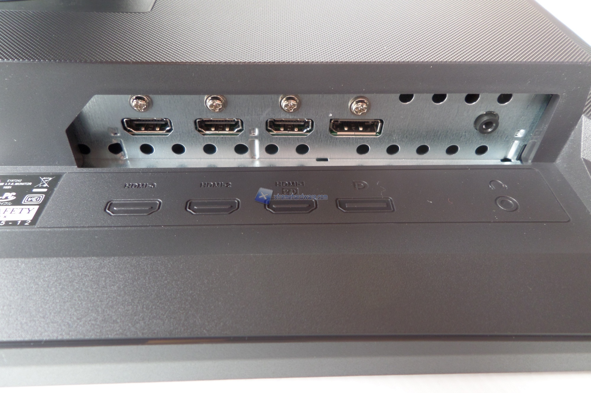 Posteriormente sono riportati i comandi fisici per l'OSD, con le rispettive indicazioni poste sulla cornice frontale. I cinque tasti presentano una forma e sporgenza alternata così da poter essere più facilmente riconosciuti al tatto. Il tasto rosso a 5 vie è invece un joystick che permette di navigare all’interno del menù OSD piuttosto facilmente. Nella parte posteriore sinistra è posizionato il connettore di alimentazione (l'alimentatore è integrato), mentre nella parte destra si hanno due porte HDMI 1.4, una porta HDMI 2.0, una DisplayPort e un'uscita jack audio da 3,5 mm.