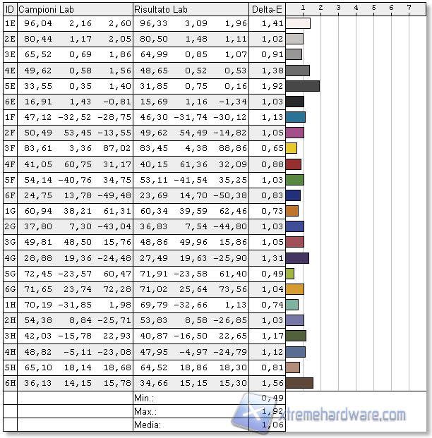 La fedeltà cromatica nelle condizioni out-of-box risulta davvero molto buona, con un Delta-E medio di 1,06.