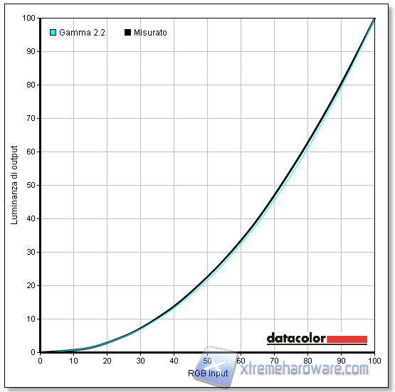 Soddisfacente è il range di luminosità che va da un minimo di 84 cd/mq a un massimo di 376 cd/mq. La copertura dello standard Adobe RGB è del 100%, così come per quello sRGB. Dal grafico si può notare che il response sia generalmente in linea con lo standard Adobe, eccedendo però nella zona del colore verde e rosso.