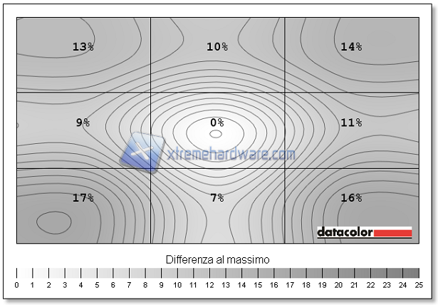 In questo test andiamo a valutare la deviazione colorimetrica all’aumentare dell’angolo di visione per i quattro lati. In questo test prevalgono in genere i display a matrice IPS / PLS / AHVA; seguono i VA e infine i TN.