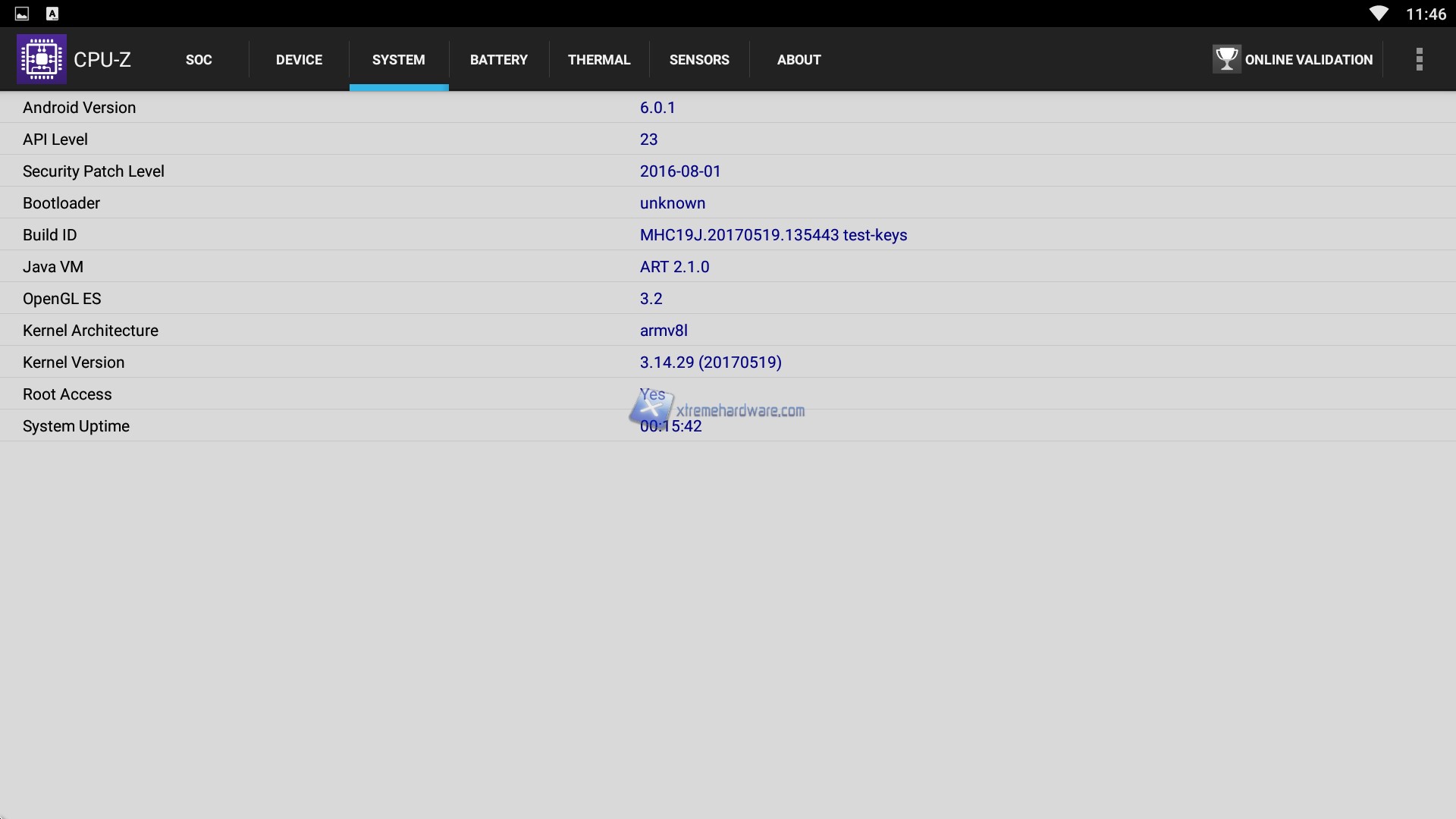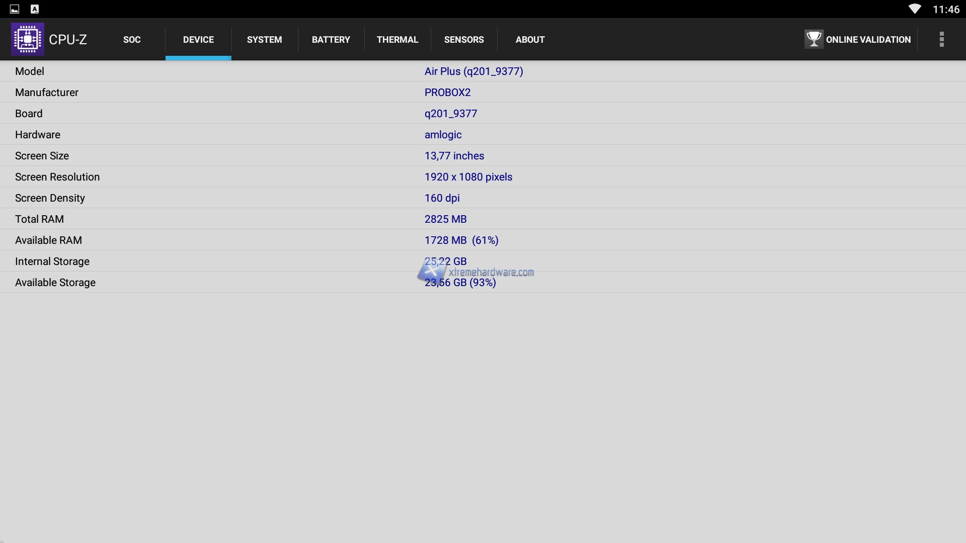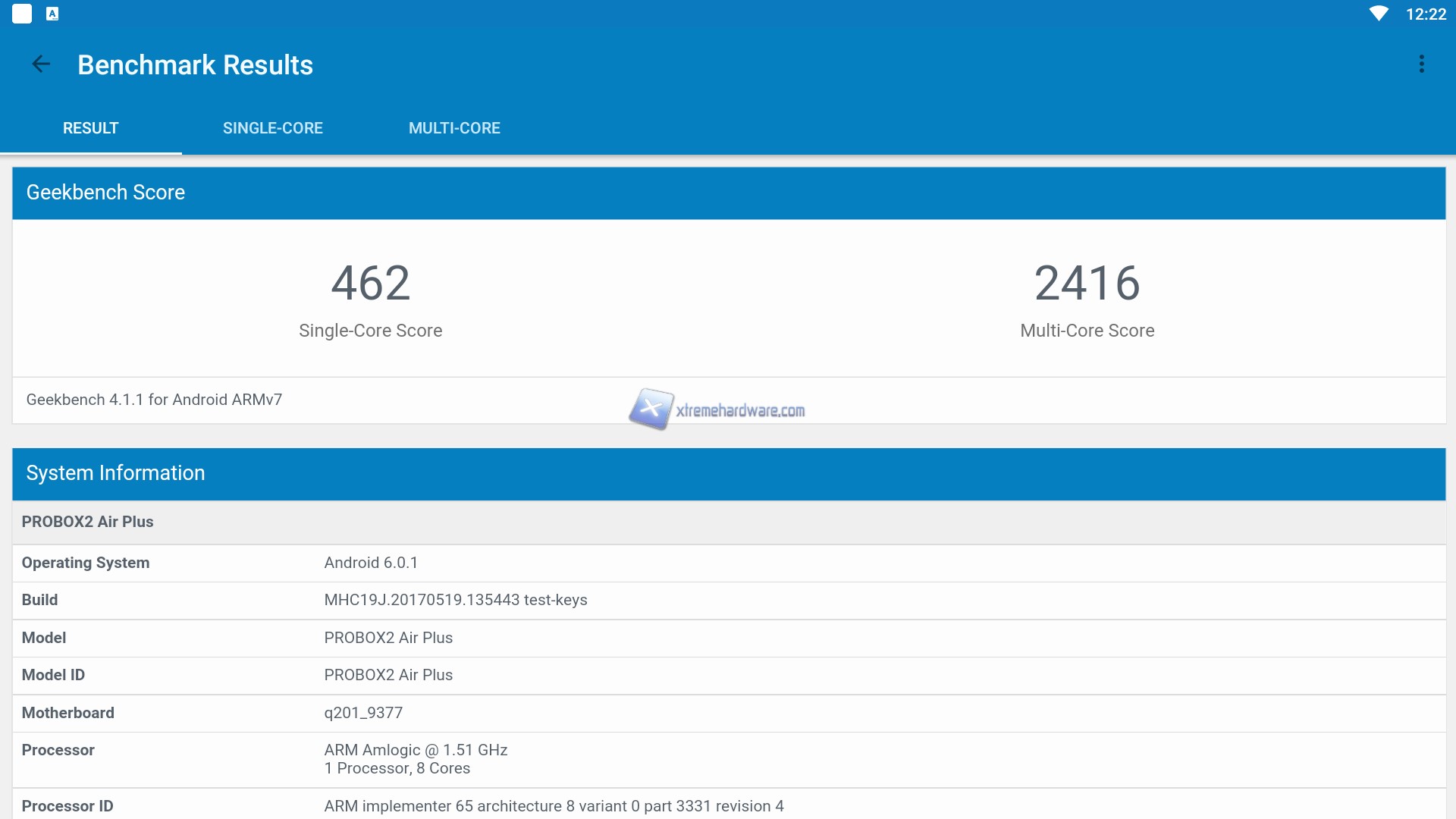 Come prima cosa abbiamo scaricato e installato CPU-Z per verificare a fondo i dettagli tecnici ed Hardware del PROBOX2 Air Plus. Installato ed avviato come vediamo subito ci viene mostrata l’architettura Octa Core della CPU Amlogic S912 su base ARM Cortex-A53 con frequenza minima di 100 MHz e massima di 1,51 GHz. Inoltre, è confermato il comparto grafico affidato ad una Mali T820, GPU SoC, di fascia bassa che supporta OpenGL ES 3.2 con una frequenza di 600 Mhz ed una cache di livello 2 massima di 512KB. La RAM disponibile è di 3GB a cui si aggiungono i 32GB di eMMC per app e dati. A seguire notiamo come sia implementato un sistema Android Marshmallow 6.0.1.