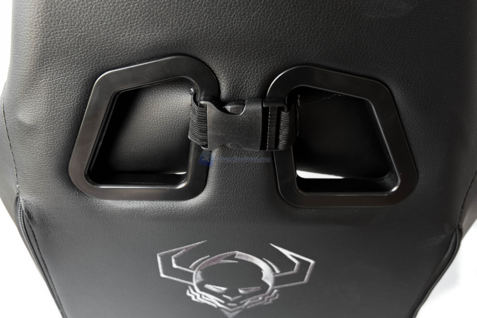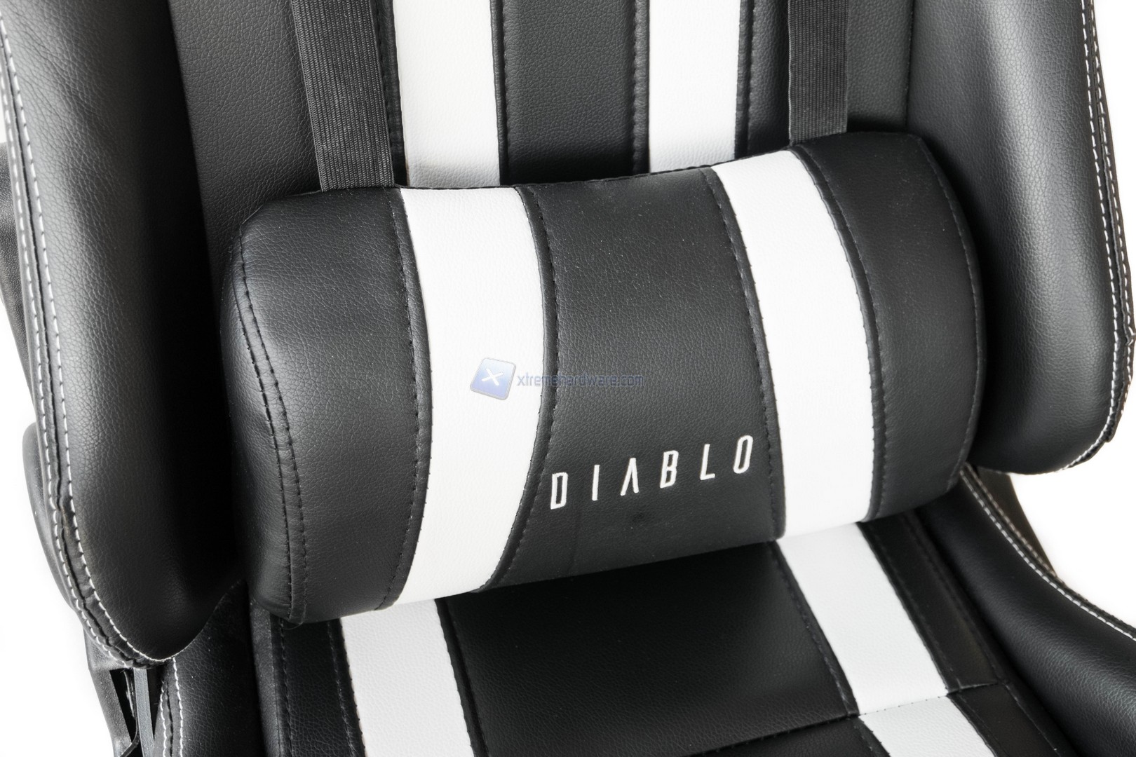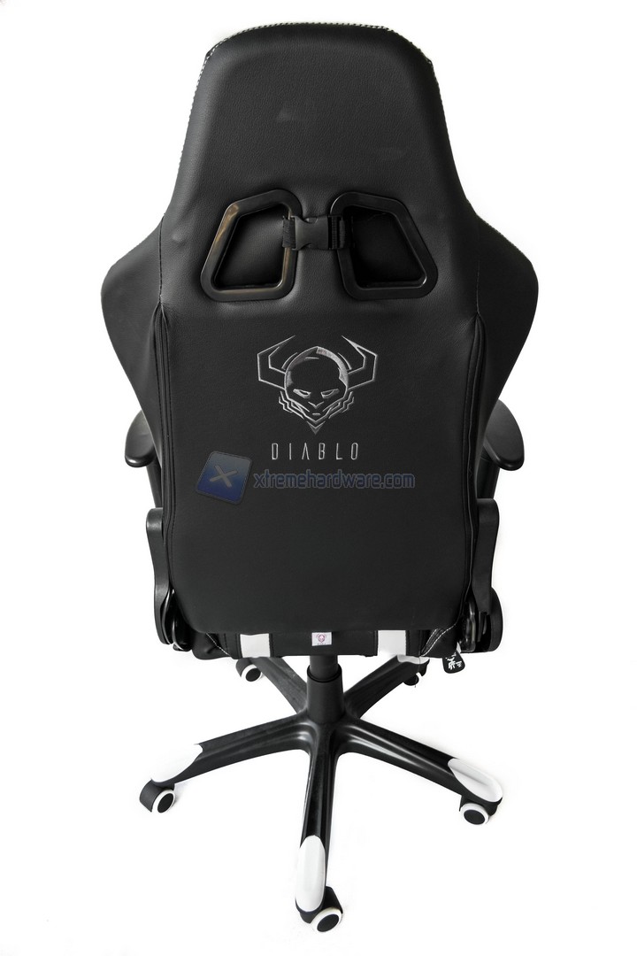 Iniziamo la nostra analisi del prodotto partendo dallo schienale. La X-One non presenta un cuscino integrato nel poggiatesta, ma dovremo legare a quest’ultimo il cuscino cervicale dato in dotazione, che si dimostra abbastanza soffice ed ergonomico. Sul poggiatesta è presente il logo dell’azienda, in questo modello ricamato e non stampato, particolare che fa emergere la cura per il dettaglio riservata alla X-One. Scorrendo poco più in basso sono presenti due fori ripresi dai sedili da corsa, ma che in questo caso hanno una funzione ben diversa. Infatti nella variante da pista servono per far passare le cinture da gara, mentre nel nostro caso servono per allacciare i due cuscini in dotazione nella zona posteriore dello schienale grazie a degli elastici. Lo schienale è abbastanza ampio, difatti risulterà comodo anche per le persone di una certa stazza, inoltre è rivestito in similpelle che regala un’ottima sensazione di qualità. La parte interna dello schienale presenta due strisce verticali bianche, che spezzano la monotonia del design e rendono il prodotto più dinamico ed interessante. Il rivestimento dello schienale, anche non facilmente, è estraibile e lavabile, grazie alla presenza di una zip, infine ha un angolo di inclinazione che va dai 90° ai 180°. La regolazione dell’angolo a 180° ci permetterà di rilassarci e schiacciare un pisolino. L’inclinazione ha una duplice regolazione, infatti può essere bloccata o sbloccata grazie ad una leva posizionata sul lato destro, inoltre può essereregolata la forza necessaria per inclinare lo schienale grazie ad una manopola collocata sotto la seduta. Posteriormente troviamo il logo Diablo e una piccola etichetta riportante il logo dell’azienda. I lati dello schienale sono ancorati alla seduta tramite dei montanti in acciaio, rivestiti da delle parti in plastica per migliorarne il design.