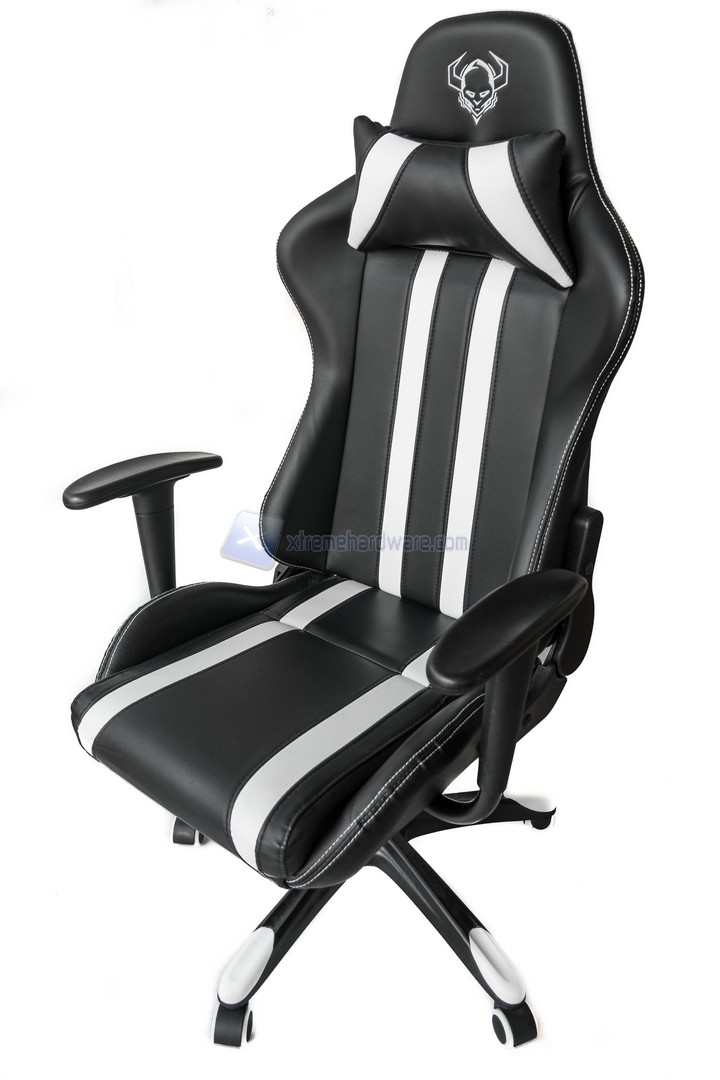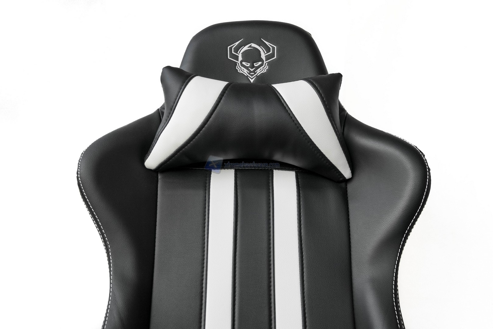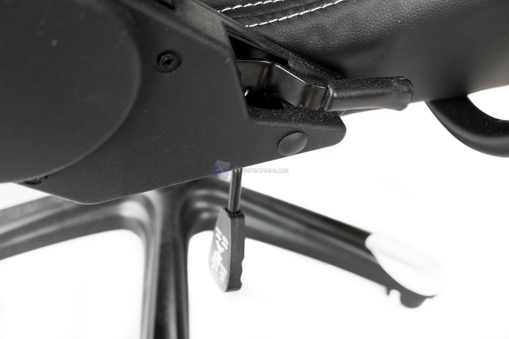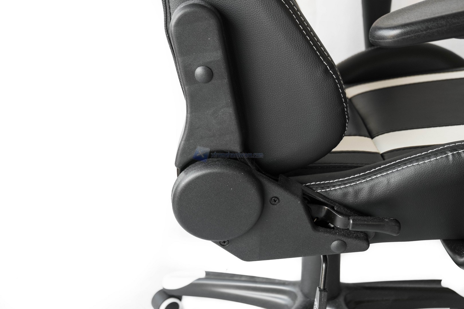 Iniziamo la nostra analisi del prodotto partendo dallo schienale. La X-One non presenta un cuscino integrato nel poggiatesta, ma dovremo legare a quest’ultimo il cuscino cervicale dato in dotazione, che si dimostra abbastanza soffice ed ergonomico. Sul poggiatesta è presente il logo dell’azienda, in questo modello ricamato e non stampato, particolare che fa emergere la cura per il dettaglio riservata alla X-One. Scorrendo poco più in basso sono presenti due fori ripresi dai sedili da corsa, ma che in questo caso hanno una funzione ben diversa. Infatti nella variante da pista servono per far passare le cinture da gara, mentre nel nostro caso servono per allacciare i due cuscini in dotazione nella zona posteriore dello schienale grazie a degli elastici. Lo schienale è abbastanza ampio, difatti risulterà comodo anche per le persone di una certa stazza, inoltre è rivestito in similpelle che regala un’ottima sensazione di qualità. La parte interna dello schienale presenta due strisce verticali bianche, che spezzano la monotonia del design e rendono il prodotto più dinamico ed interessante. Il rivestimento dello schienale, anche non facilmente, è estraibile e lavabile, grazie alla presenza di una zip, infine ha un angolo di inclinazione che va dai 90° ai 180°. La regolazione dell’angolo a 180° ci permetterà di rilassarci e schiacciare un pisolino. L’inclinazione ha una duplice regolazione, infatti può essere bloccata o sbloccata grazie ad una leva posizionata sul lato destro, inoltre può essereregolata la forza necessaria per inclinare lo schienale grazie ad una manopola collocata sotto la seduta. Posteriormente troviamo il logo Diablo e una piccola etichetta riportante il logo dell’azienda. I lati dello schienale sono ancorati alla seduta tramite dei montanti in acciaio, rivestiti da delle parti in plastica per migliorarne il design.