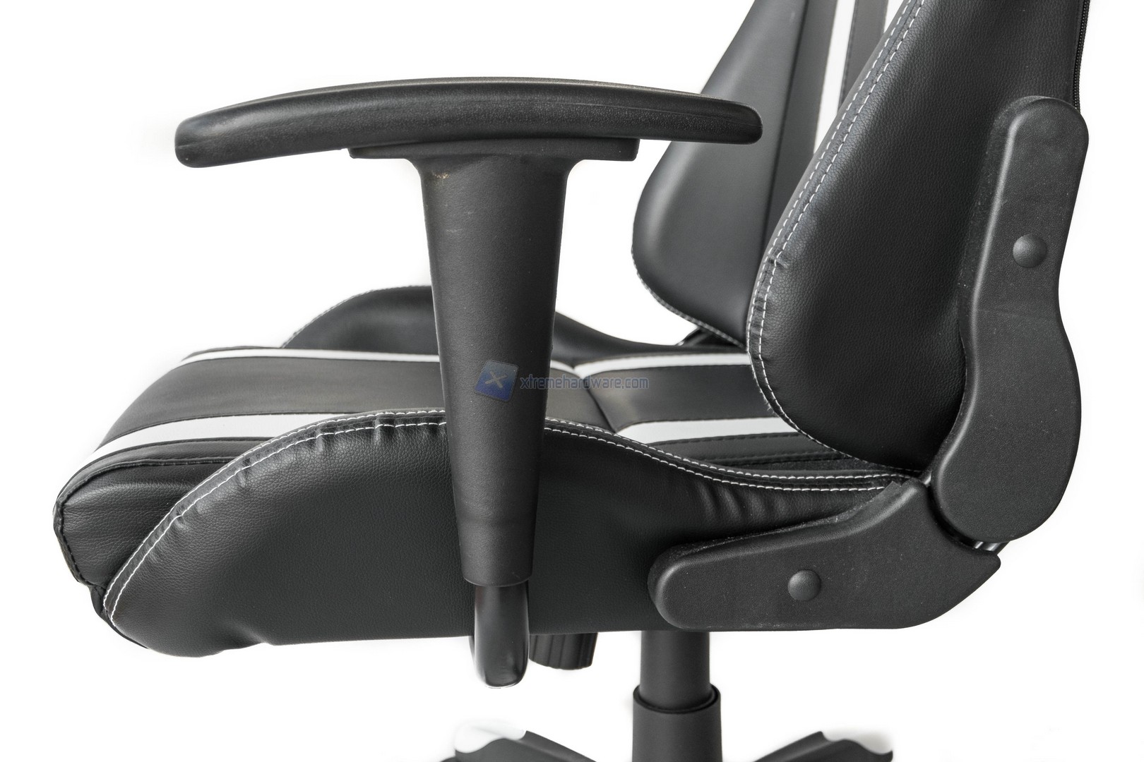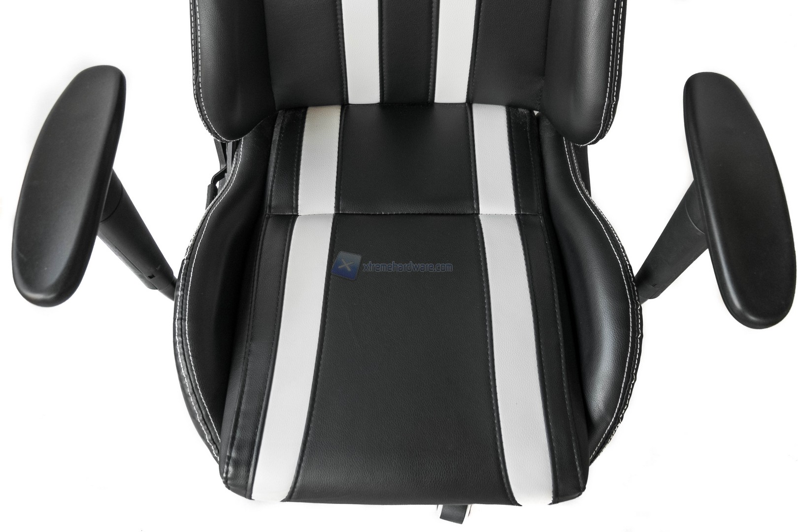 La seduta si presente più contenuta rispetto alla X-Fighter, ma rimanendo comunque sufficientemente ampia da ospitare la maggior parte degli utenti. Quest’ultima presenta lo stesso design a doppia striscia bianca visto sullo schienale, ma offre un’imbottitura maggiore per restituire il migliore comfort possibile. I braccioli sono fissi in altezza, profondità e angolazione, ma propongono una buona imbottitura in gomma. L’altezza della seduta è personalizzabile grazie alla presenza di una leva posizionata sulla destra, che permette di variare dai 47 ai 54 cm d’altezza. I fianchetti sono ben imbottiti ed avvolgenti.