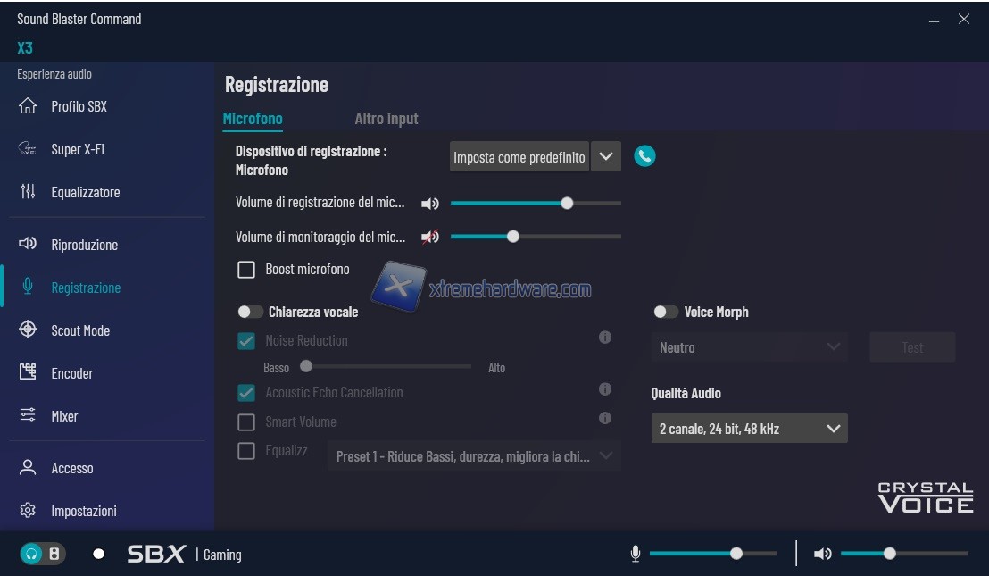 Menu ‘’Registrazione’’ permette di gestire e personalizzare le impostazioni relative l’entrata Microfono. Il Tuning è completo e non manca nulla.