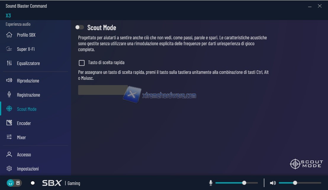 Menu ‘’Scout Mode’’. La già conosciuta modalità adibita a coloro che giocano FPS e hanno bisogno/ricercano una maggiore percezione della spazialità/suono dei passi o di quei rumori che spesso sono importanti ad avere un vantaggio tecnico. Come vediamo potremo creare anche una shortcut per attivare/disattivare la funzione ad hoc.