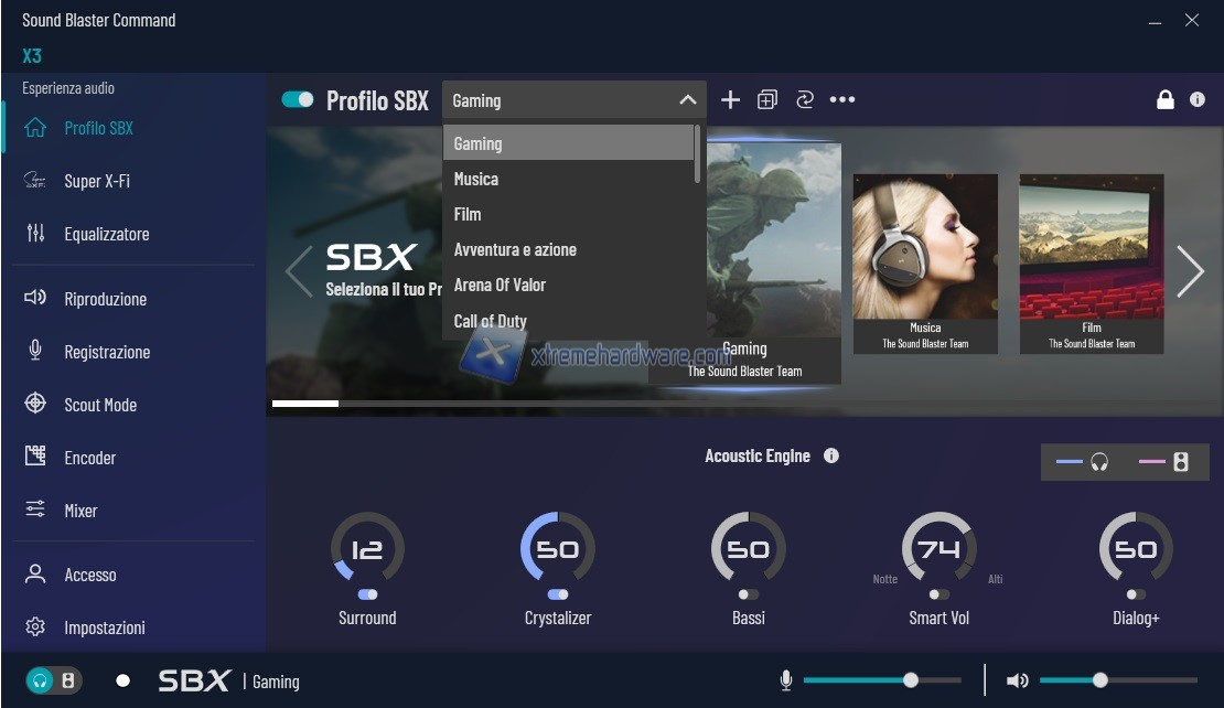 Si parte da ‘’Profilo SBX’’ dove troviamo una lista di diversi profili precaricati. Profili che potranno essere scelti dal Menu a tendina a tramite scorrimento laterale con le frecce. Oltre i classici di default sono presenti anche diversi giochi tra i più famosi. Ogni profilo mette a disposizione poco più sotto alcune voci che sono ‘’Surround’’, ‘’Crystalizer’’, ‘’Bassi’’, ‘’Smart Vol’’ e infine ‘’Dialog+’’ che potranno essere eventualmente personalizzati nel caso il Preset di base per quel Profilo non sia di vostro gradimento. Avrete inoltre massima libertà di personalizzazione con cui editare suddetti profili. Creazione, cancellazione, salvataggio.