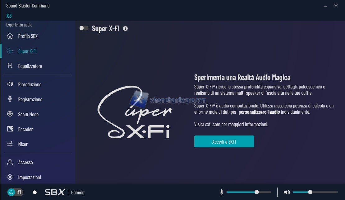 Menu ‘’Accesso’’ garantisce l’attivazione delle funzioni di gestione profili e controllo della scheda e della funzione Super X-FI.