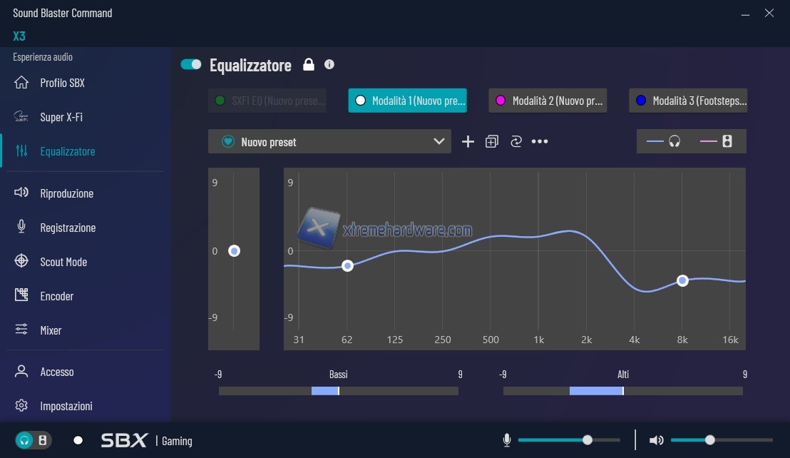 Menu ‘’Equalizzatore’’ come suggerisce già il nome ci permette di avere dei Profili precaricati o di personalizzarli secondo le nostre esigenze. Potremo impostare i principali come funzione di scelta rapida. In questo modo ci basterà cliccare il tasto fisico sulla scheda per richiarmarlo al volo. Non dovremo più ALT-Tabbare o fare giri particolari. Tutto sarà a portata di dito.