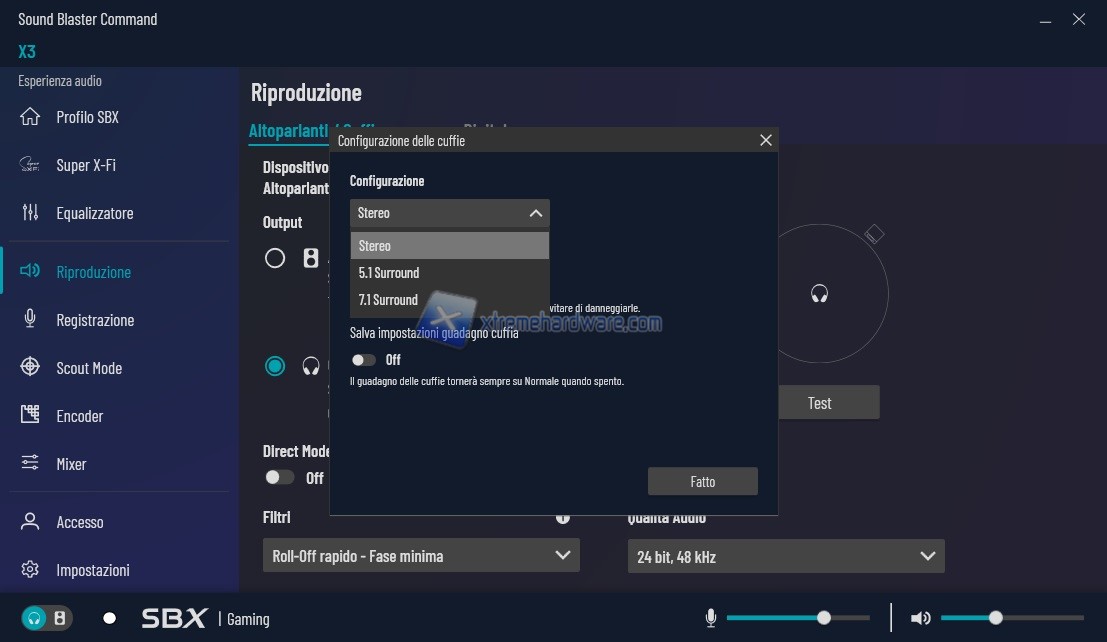 Proseguendo tra i Menu principali si passa a ‘’Super X-FI’’. Il Menu permette di agire e di avere, previa registrazione e download su smartphone dell’App, una mappatura del vostro orecchio e successiva creazione anche in base alla tipologia di cuffia che state utilizzando (sono presenti come predefinite solo le principali o le più conosciute/commercializzate) di un profilo che darà il meglio dalla tecnologia Super X-FI. Ciò permetterà a Creative due cose. La prima la creazione di un database in costante aggiornamento e la seconda lo sviluppo della suddetta tecnologia con quante più informazioni possibili fornite direttamente dagli utenti finali.
