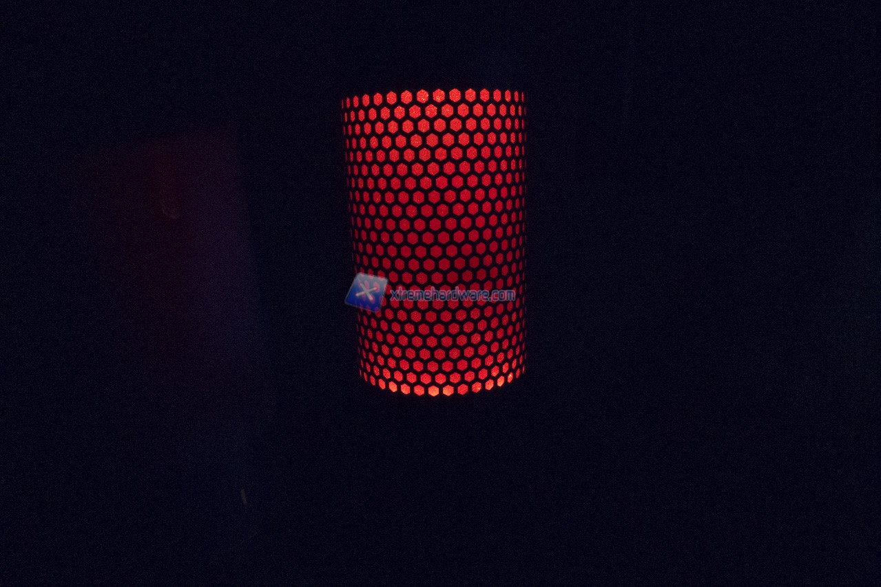 Osservandolo più da vicino possiamo notare la struttura superiore in metallo aperta con una trama a nido d’ape. Si nota grazie alla colorazione rossa il filtro antipop già integrato che andrà a ridurre/sopprimere la maggioranza di rumore e uniformare la nostra voce. Questa zona sarà illuminata, grazie ad un LED posto sempre all’interno, di colore rosso.