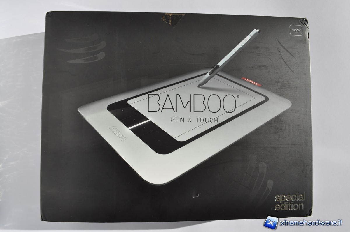 La Bamboo Special Edition è racchiusa in una scatola di adeguate dimensioni e di un colore nero opaco molto elegante. Essendo un prodotto destinato a persone del campo della grafica ed affini, non poteva di certo essere imballato in un anonimo involucro di cartone. La confezione, infatti, risulta piuttosto curata sia dal punto di vista estetico, sia, soprattutto, dal punto di vista della sicurezza dell’imballaggio contro eventuali urti. La grafica propone nella parte superiore della scatola un’immagine della tavoletta stampata su fondo nero, con la scritta al centro con il nome del prodotto, e in basso a destra un’impressione argentata a sottolineare che questo prodotto è un’edizione speciale. Nel retro della scatola troviamo rapprensentate ordinatamente e in maniera piuttosto intuitiva le caratteristiche salienti del prodotto.