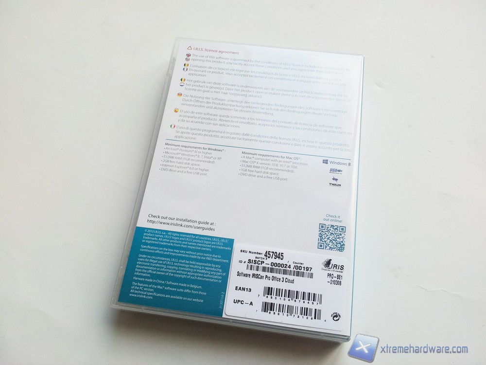 L'intera confezione è ricca di dettagli relativi alle caratteristiche tecniche e alla dotazione dello scanner oggetto della recensione, nella parte frontale troviamo la scritta "You Scan, it connects to the cloud" (tu scannerizzi lui si connette in cloud), l'IRIScan Pro 3 Cloud infatti, come suggerisce lo stesso nome, permette di archiviare direttamente i documenti scansionati in un Cloud Server, come indica l'immagine che segue la scritta è compatibile con i maggiori servizi di Cloud Computing in circolazione come Microsoft Share Point, IRISnext, Google Drive, EverNote, Box, Dropbox e SkyDrive.