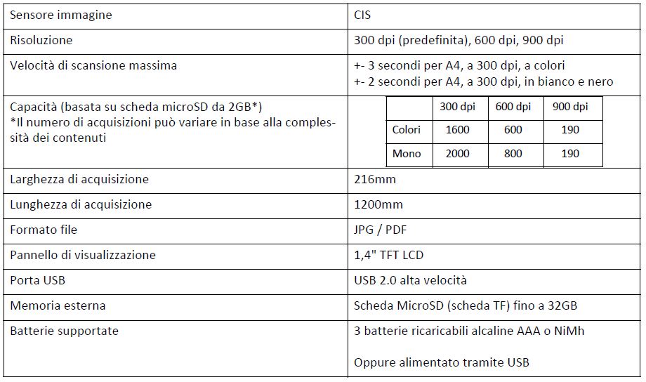 Come si può notare è possibile acquisire documenti anche alla risoluzione di 900DPI, come andremo a vedere in seguito comunque non sarà necessario spingere il sensore ad effettuare scansioni con tale densità soprattutto considerando che lo scanner è realizzato per scannerizzare pagine di libri e quindi solitamente pagine di testo. Vi è inoltre la possibilità di montare microSD fino a 32GB, ci teniamo comunque a precisare che già la scheda da 2GB in dotazione permette di salvare una grande mole di dati.
