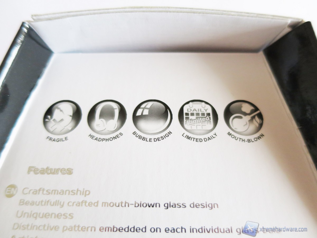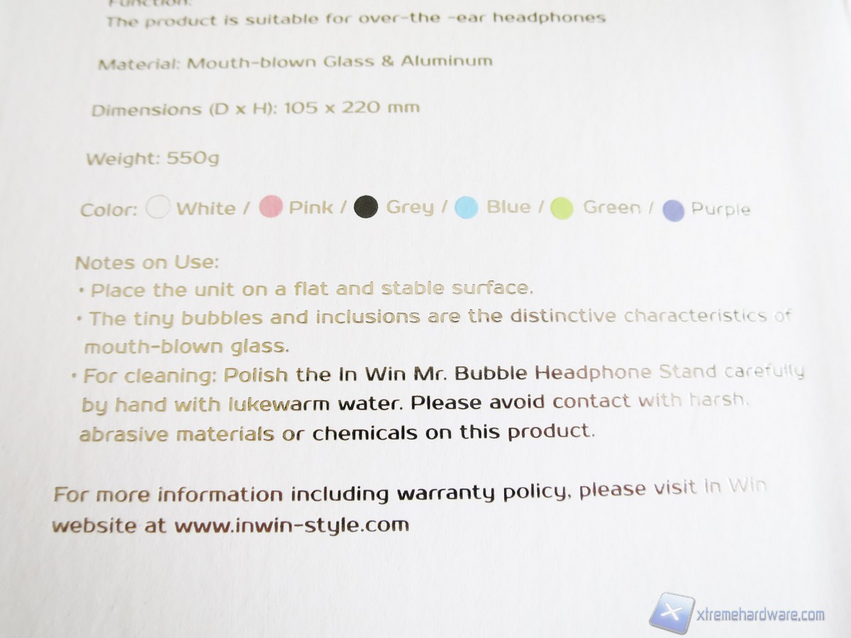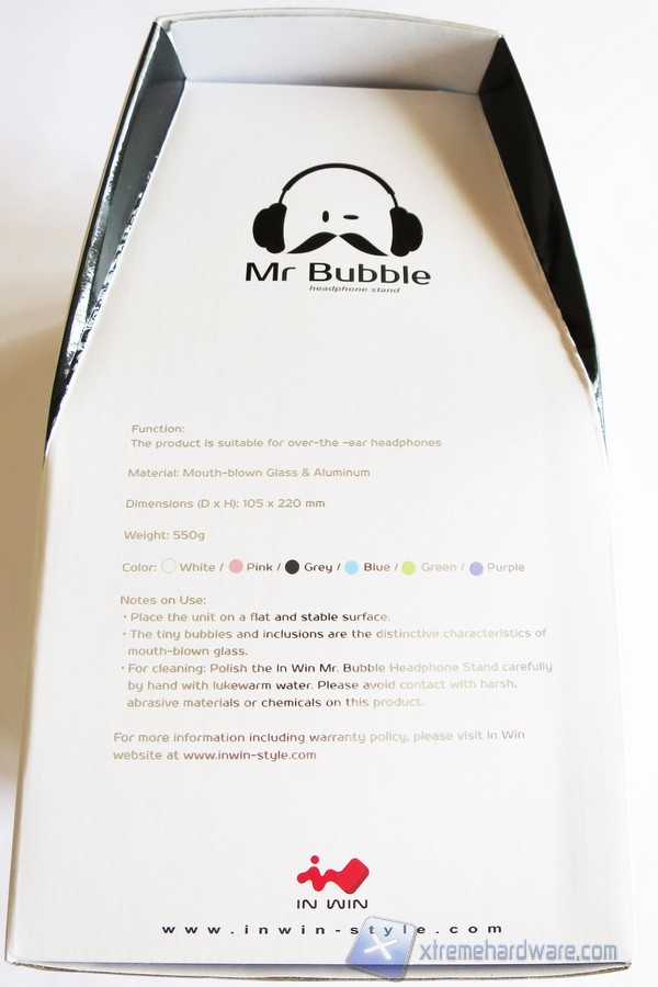 La confezione dell’In Win Mr.Bubble è  realizzata in cartone di colore bianco con una forma sagomata e riporta tutte le informazioni necessarie inerenti al prodotto. Nella parte frontale trova posto un’apertura che ci permette di toccare con mano il prodotto contenuto all’interno. La grafica è molto carina in quanto intorno all’apertura sono poste delle cuffie (del colore del prodotto scelto) che ci rendono subito l’idea del contenuto.